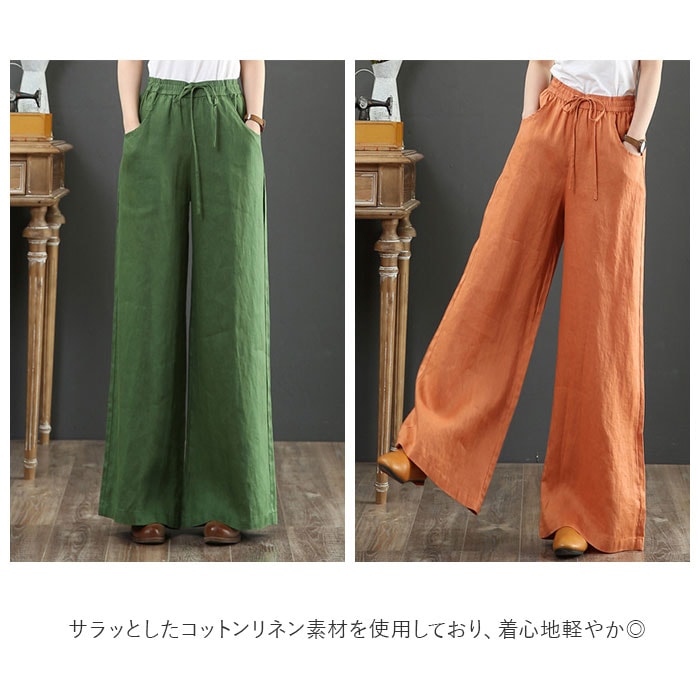 | 商品説明 | シンプルなデザインで着回し力抜群!リネンワイドパンツが新登場。サラッとしたコットンリネン素材を使用しており、着心地軽やか◎気になるボディラインをふんわりカバーできちゃう、ワイドシルエット。締めつけ感のないウエストゴム仕様。紐でサイズ調節も可能。左右に便利なポケット付き。落ち着いた色合いのバリエーション。大人のリラックスコーデにぴったり。(※カラーによりやや透け感があるため、お手持ちのペチパンツなどと合わせての着用をおすすめします。) |