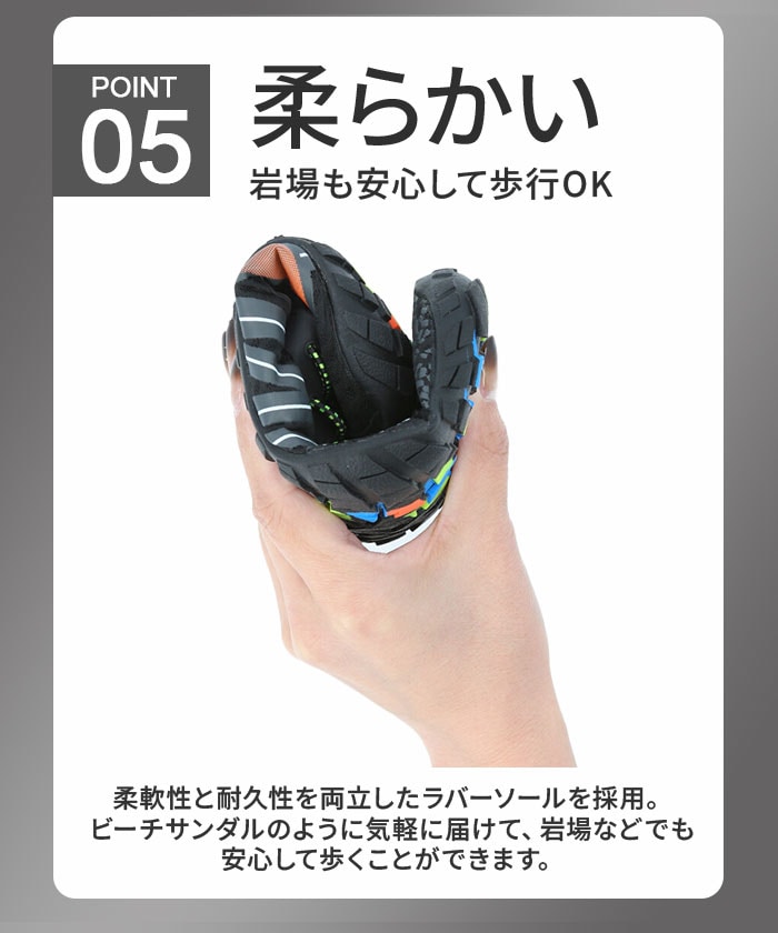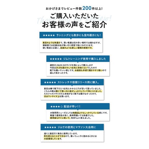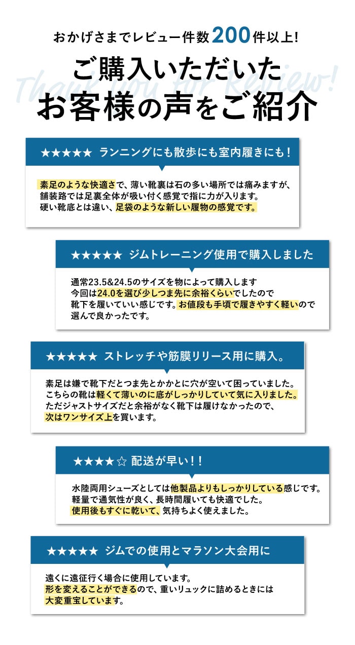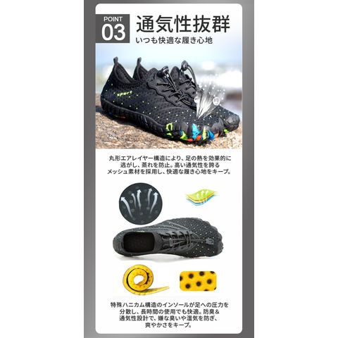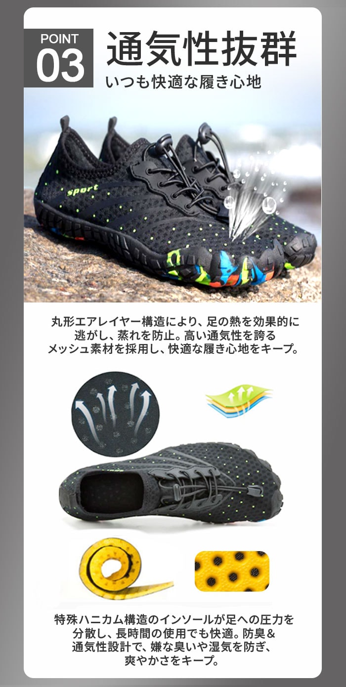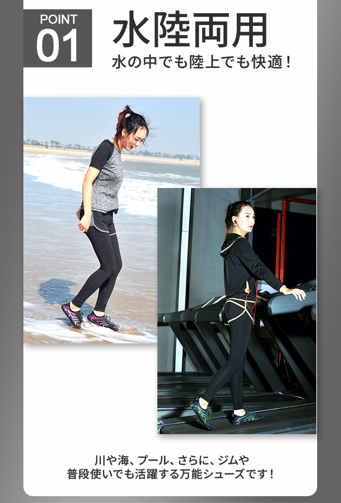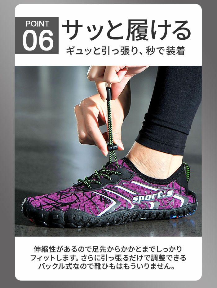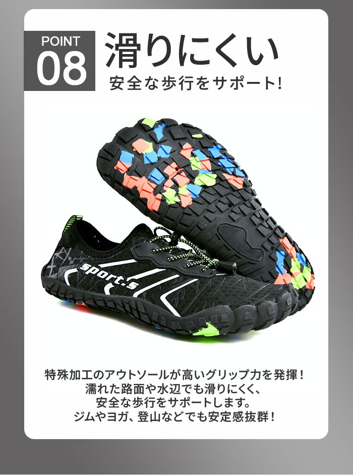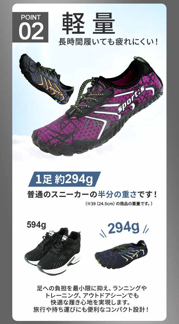 | 商品説明 | まるで素足のように軽くて快適!フィットネスやアウトドアで活躍する「トレーニングシューズ(水陸両用タイプ)」が新登場。【ふわっと軽快な履き心地】片足約145gの軽量設計。履いていることを忘れてしまうほどの軽い履き心地で、軽快なフットワークを実現。(※24.5cmサイズの商品、片足分の重量です。)【ぐ~んと伸びて、足にフィット】伸縮性に優れたニット生地がつま先からかかとまでぴったりフィット!素足のまま履いても、柔らかくて快適。【通気性抜群のニット素材】アッパーはメッシュ状のニット生地で仕上げてあるため、通気性が高く、気になるムレ対策にも効果的。【衝撃吸収インソール】クッション性の高いインソールが足裏にかかる衝撃を優しく吸収し、運動時の足元をしっかりとサポート。【水陸でマルチに活躍】水の中にシューズのまま入っても、メッシュニットが水を通し、ソールの排水穴からも水が抜けるため、早く乾いて快適さをキープ。【脱ぎ履きスムーズ】伸縮性のある履き口にはつま先がスッと入って、運動前の装着がスムーズ。ネオンカラーのドローコードで足の甲の高さに合わせてサイズ調整も自在。【滑りにくいアウトソール】つま先に足指の凹凸を再現したアウトソールが、素足のように地面をグリップ。滑り止めの溝がしっかりと刻まれているので、安定感もばっちり。【持ち運び、コンパクト】アウトソールには屈曲性があり、キュッと丸めてコンパクトに収納可能。フィットネスジムへの持ち運びもスマートに。【お手入れ簡単、いつでも清潔】カップインソールは取り外しができるので、手軽に水洗いができていつでも清潔さをキープ。【スポーツやアウトドアに最適】ジムでのトレーニングや、ランニングなどのフィットネスにはもちろん、水辺のアクティビティーではマリンシューズとして大活躍。 |