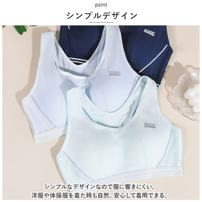 | 商品説明 | ノンワイヤーだけどしっかりホールド。コットン使用でお肌に優しく、メッシュタイプでムレにくい「スポーツブラ ジュニア」が登場!【やさしい生地】コットンを使用した柔らかな生地で、お肌にも安心でやさしい着け心地。両サイドがメッシュ仕様になっており、通気性が抜群で暑い日も快適◎【ファーストブラに】ノンワイヤーで締め付け感が少なく、ふくらみ始めるバストにオススメの違和感が少ない柔らかい肌あたり。成長期ティーンズのバストに自然になじむ。【バッククロスタイプ】ずり落ちがしにくい、バッククロスタイプ。肩紐も太めで肩が痛くなりにくい。スポーツブラなので動きやすく、運動時もストレスフリー。【幅広アンダー】アンダー部分は幅広設計。くるっとめくれ上がりしにくく、しっかりホールド。【シンプルデザイン】シンプルなデザインなので服に響きにくい。洋服や体操服を着た時も自然。安心して着用できる。 |
