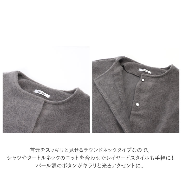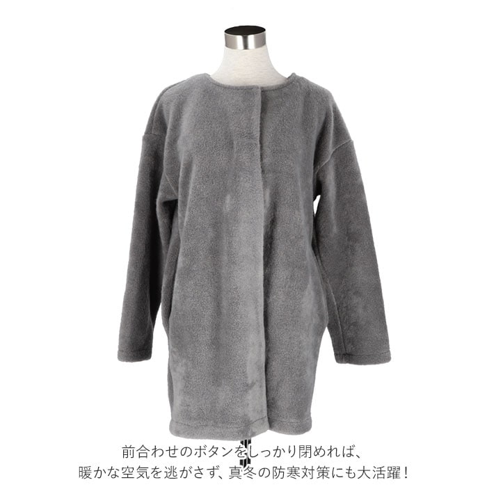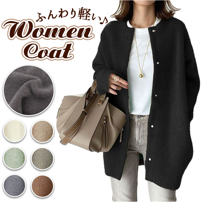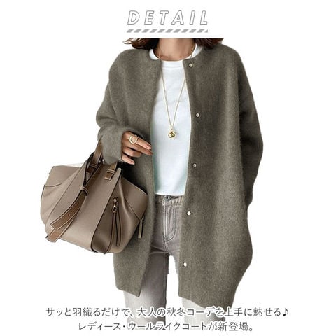 | 商品説明 | サッと羽織るだけで、大人の秋冬コーデを上手に魅せる♪レディース・ウールライクコートが新登場。ふんわり軽い、厚手のウール調素材が身体をすっぽり包んでポカポカと快適。リッチな素材感で季節を先取り!前合わせのボタンをしっかり閉めれば、暖かな空気を逃がさず、真冬の防寒対策にも大活躍!ドロップショルダー気味にゆるっと肩に掛けるだけで、女性らしい華奢なシルエットを手軽に演出!パール調のボタンがキラリと光るアクセントに。首元をスッキリと見せるラウンドネックタイプなので、シャツやタートルネックのニットを合わせたレイヤードスタイルも手軽に!腰回りからヒップまで、ふわっと包み込むような長めの丈感が気になる体型カバーにも効果的。フィットジーンズやワイドパンツ、ワンピースなどボトムスとの組み合わせも自由自在。 |