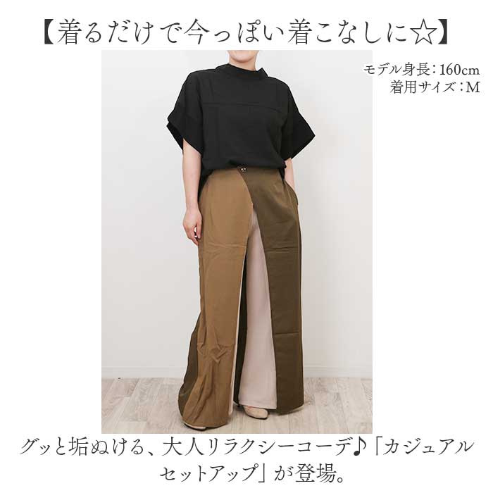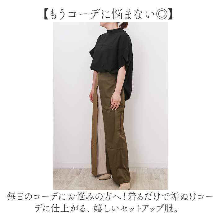 | 商品説明 | 【着るだけで今っぽい着こなしに☆】グッと垢ぬける、大人リラクシーコーデ♪「カジュアル セットアップ」が登場。【もうコーデに悩まない◎】毎日のコーデにお悩みの方へ!着るだけで垢ぬけコーデに仕上がる、嬉しいセットアップ服。【大人リラクシーがお気に入り♪】カジュアルだけどちゃんと女性らしい、上品な雰囲気。頑張りすぎないおしゃれがGOOD◎【ゆるっと風通しの良い着心地】二の腕をカバーする、ゆるっと広めの袖口がポイント。風を通すから涼しい着心地で快適に。【シンプルだけど表情豊かに】大人っぽいシンプルデザインに、パンツのバイカラーでアクセントをプラス。【アクセサリーみたいなワンポイント】背中とウエストに、ゴールドのワンポイントを♪さりげない華やかさが嬉しいポイント。【着回し力が自慢のアイテム】セットアップだけでなく、単品で着るのも◎シンプルだから合わせやすく、着回し力バツグン! |
