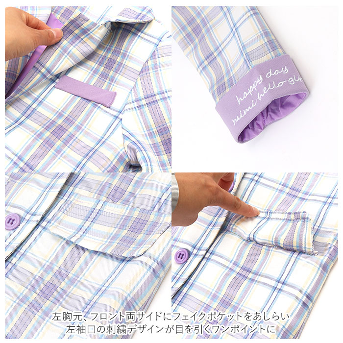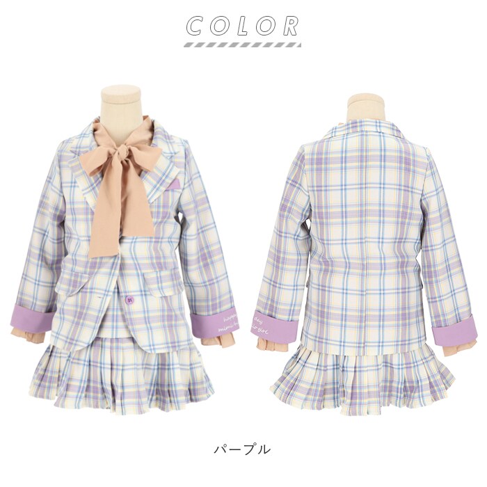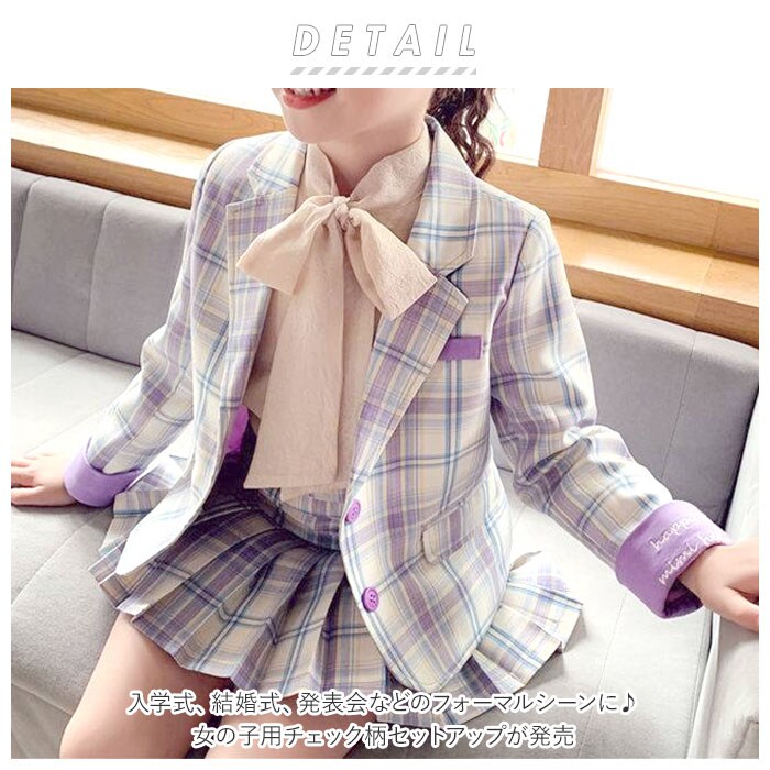 | 商品説明 | 入学式、結婚式、発表会などのフォーマルシーンに♪女の子用チェック柄セットアップが発売。ジャケット・・・裏地の付いたしっかりとしたつくり。左胸元、フロント両サイドにフェイクポケットをあしらい、左袖口の刺繍デザインが目を引くワンポイントに。ブラウス・・・襟元にリボン紐をドッキングさせたボウタイブラウス。袖口にフリルをあしらったギャザーデザイン。とろみ感のある柔らかい肌触りの着心地を実現。スカート・・・裏地の付いたしっかりとしたつくり。ウエストは着脱がラクチンなゴム仕様。裾にプリーツをあしらったデザインがかわいらしくも落ち着きのあるデザインに。 |