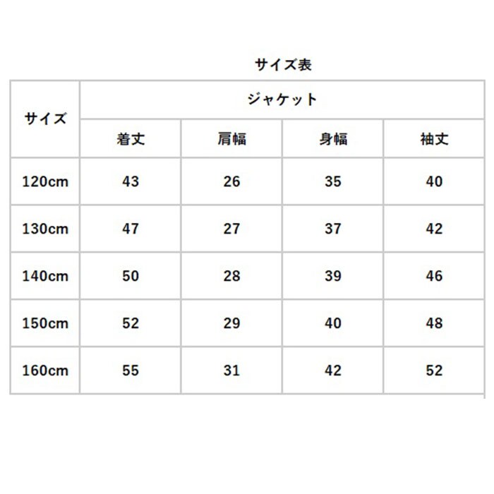 | 重量 | 【ジャケット】約218g 【ブラウス】約98g 【スカート】約161g (※140cmサイズの重量です。) |
