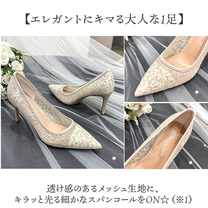 | 商品説明 | 【足元までおしゃれを抜かりなく♪】ドレスにも、お呼ばれスタイルにもマッチ♪上品な「ウェディングシューズ」。【エレガントにキマる大人な1足】透け感のあるメッシュ生地に、キラッと光る細かなスパンコールをON☆(※1)つま先とかかとは、生地を1枚重ねております。【スタイリッシュなポインテッドトゥ】つま先が尖ったポインテッドトゥタイプ。足元をキレイに魅せ、スマートな印象に。【自然なスタイルアップも叶う☆】しっかり高さを出した細いヒール。足元をスラリと演出。【落ち着きのあるカラーリング】肌馴染みが良く、色んなドレスなどに合わせやすい!結婚式や前取り後も、お呼ばれ時に活躍。(※2)中敷きが2枚付属しております。 |