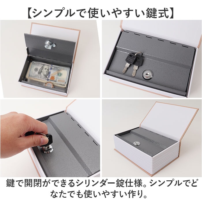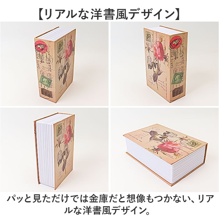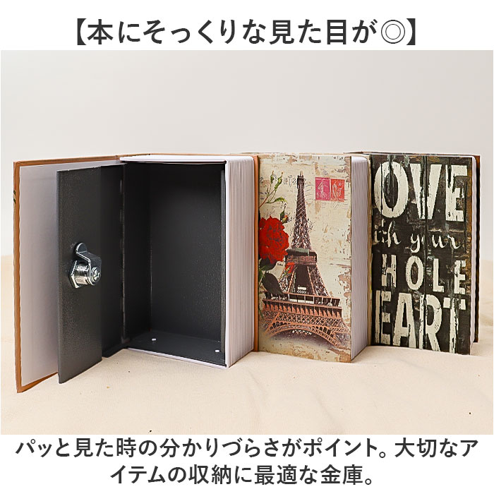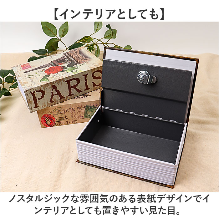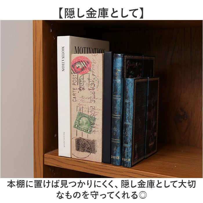 | 商品説明 | 【本にそっくりな見た目が◎】パッと見た時の分かりづらさがポイント。大切なアイテムの収納に最適な金庫。【リアルな洋書風デザイン】パッと見ただけでは金庫だと想像もつかない、リアルな洋書風デザイン。【隠し金庫として】本棚に置けば見つかりにくく、隠し金庫として大切なものを守ってくれる◎【シンプルで使いやすい鍵式】鍵で開閉ができるシリンダー錠仕様。シンプルでどなたでも使いやすい作り。【インテリアとしても】ノスタルジックな雰囲気のある表紙デザインでインテリアとしても置きやすい見た目。 |