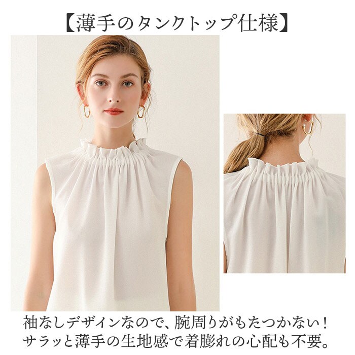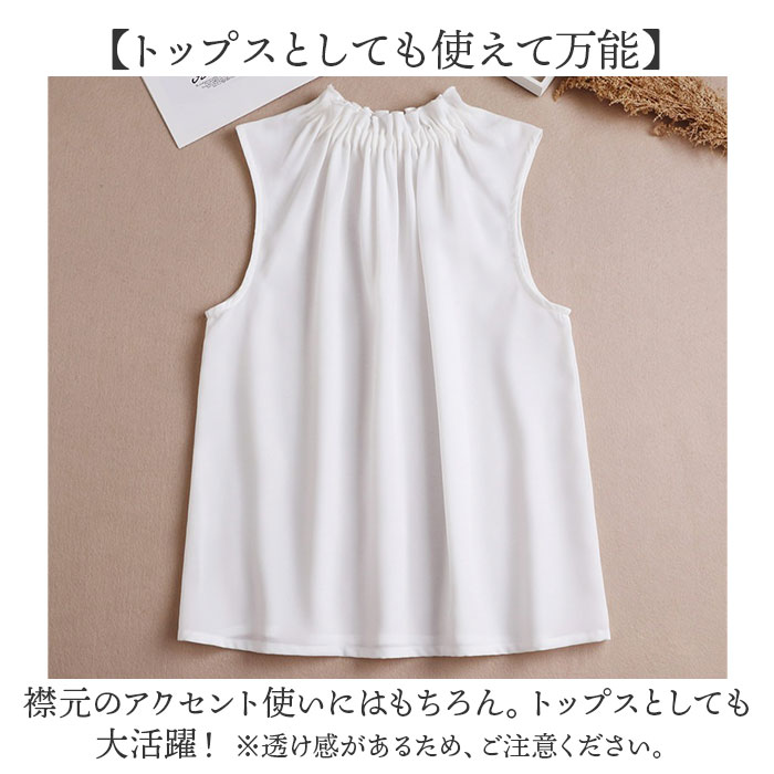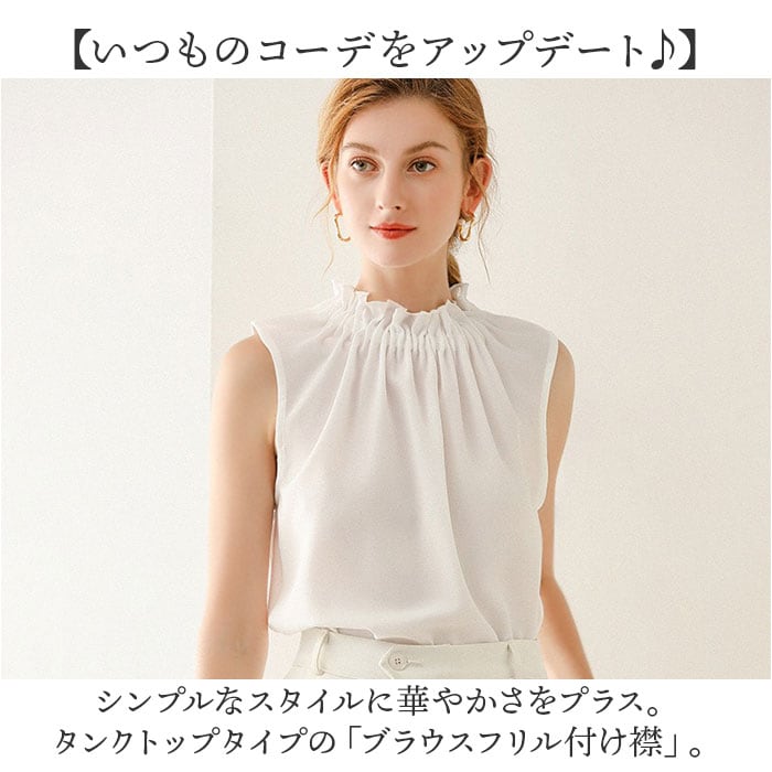 | 商品説明 | 【いつものコーデをアップデート♪】シンプルなスタイルに華やかさをプラス。タンクトップタイプの「ブラウスフリル付け襟」。【仕込んでレイヤード風のアレンジ】インナーのように着用し、お手持ちのトップスやカーディガンを。簡単レイヤードスタイルに☆【薄手のタンクトップ仕様】袖なしデザインなので、腕周りがもたつかない!サラッと薄手の生地感で着膨れの心配も不要。【上品なフリルデザインがアクセント】シンプルなワンカラーに、襟元のフリルがおしゃれ♪心地よくフィットするゴム仕様◎【トップスとしても使えて万能】襟元のアクセント使いにはもちろん。トップスとしても大活躍!(※)透け感があるため、ご注意ください。 |
