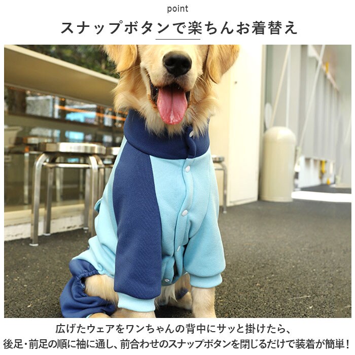 | 商品説明 | 大型のワンちゃんもスタイリッシュに着こなせる♪動きやすくて、ほっこり暖かい「ペットウェア」が新登場。 【ふんわり着せて、優しく防寒】表側は肌触りの滑らかなトレーナー生地に、裏地はふんわり柔らか起毛素材仕上げ。ウェアの内側の暖かな空気をキープして、肌寒い季節でもほっこり快適。【スナップボタンで楽ちんお着替え】広げたウェアをワンちゃんの背中にサッと掛けたら、後足・前足の順に袖に通し、前合わせのスナップボタンを閉じるだけで装着が簡単!【ピタッと可愛いシルエットに】ハイネックデザインの首回りとお腹周りのパイピングが程よく伸縮し、ワンちゃんの身体にピタッとフィット。袖口のリブがスキマ風をシャットアウトして、木枯らしが吹く日も元気にお散歩!【リードをつないで、お散歩にGO!】背中のファスナーを軽く下げれば、首輪のDカンとリードのフックをスムーズに接続可能。お散歩が待ちきれないワンちゃんにぴったり!【歩行補助ハンドルで飛び出し防止】交差点での信号待ちや、車道でのワンちゃんの急な走り出しを防ぐ「飛び出し防止補助ハンドル」付き。シニアのワンちゃんの歩行アシストにも大活躍。【おトイレ楽ちん・ゆったり設計】ワンちゃんがおトイレする時にもたつかない♪お腹周りやお尻が大きく開いたゆったりデザイン。【嬉しいミニポケット付き】ウェアの背中には、お気に入りのおやつやお散歩用マナーパックなどがちょこんとしまえるフラップポケットをデザイン。【ご家庭で簡単お洗濯♪】ウェアの生地は、取り扱いが楽なポリエステル素材。手洗いで優しくお手入れができるから、いつでも清潔な着心地をキープ。(※タンブラー乾燥はご利用いただけません。)【印象的なラバーネーム】・「今すぐお散歩に行くかどうか、それが問題だワン♪」背中の「THAT IS A QUESTION」のラバーネームは、ワンちゃんから飼い主さんへの願いを込めたワンポイントチャーム。 |