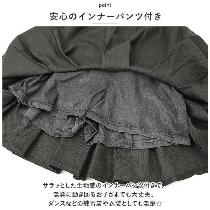 | 商品説明 | おしゃれキッズにぴったり。ふんわり広がるミニスカートが新登場。【フレアなAラインシルエット】幅広のプリーツが、裾に向けて広がるシルエット。女の子らしい印象を演出♪【安心のインナーパンツ付き】サラッとした生地感のインナーパンツ付きで、活発に動き回るお子さまでも大丈夫。ダンスなどの練習着や衣装としても活躍☆【自分サイズにフィット】締めつけを感じにくいバックゴム仕様で、心地よくフィット。フロントからの見た目もすっきり!お手持ちのベルトを取り付けできるループ付き。【色んなアイテムと合わせやすいミニ丈】足元をキレイ魅せ♪スニーカーを合わせるも良し、ブーツなどとも相性抜群。【着回し力ばっちり】トップスを選ばず使えるシンプルな無地デザイン。落ち着きのあるベーシックカラーをラインナップ。 |