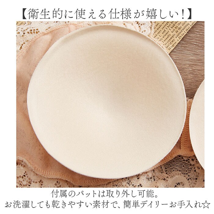 | 商品説明 | 【リラックスタイムをラク&可愛く♪】ノンワイヤーで締め付けない。ブラジャー&ショーツセット 夜ブラが登場。【ノンワイヤーでストレスフリー♪】きつい、痛いがないノンワイヤー仕様。ストレスフリーな着心地で極上のリラックスタイムを♪【レーシーデザインが大人可愛い】ほどよく透け感のあるレーシーさが魅力。上下統一感があると可愛さ倍増☆【ムレにくく暑い季節も快適】ブラはカップ以外はレース素材を使用。通気性に優れ、ベタつきにくい!【動きを邪魔しないストレッチ性】スパンデックスを使用した伸びる生地。寝ている間の動きを邪魔しないからリラックス。【衛生的に使える仕様が嬉しい!】付属のパットは取り外し可能。お洗濯しても乾きやすい素材で、簡単デイリーお手入れ☆【お好みのカラーをチョイス】肌なじみのよいシンプルカラーをご用意。お気に入りのインナーで気分をUP! |