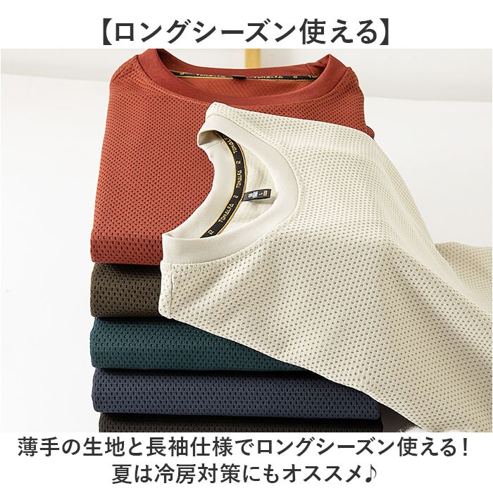 | 商品説明 | 【様々なシーンで活躍】シンプルな見た目と抜群な伸縮性で幅広いシーンで使える!メンズ長袖Tシャツが新発売【ロングシーズン使える】薄手の生地と長袖仕様でロングシーズン使える!夏は冷房対策にもオススメ♪【すっきり見えるシルエット】クルーネックと裾と袖口にリブ編みを施しすっきりとしたシルエットに。【メッシュ生地で通気性アリ】メッシュ生地を採用し、通気性があり洗濯後や汗をかいてもサラッと乾きが早いのもGOOD【スポーツシーンにも】縦横自在に伸縮もあり、スポーツやフィットネスジム用のウェアにもオススメ♪【コーデを選ばないワンカラー】様々なコーデに合わせやすいワンカラー。さらに誰でも着やすいベーシックカラー展開なのも◎ |