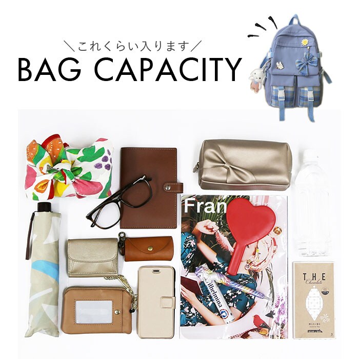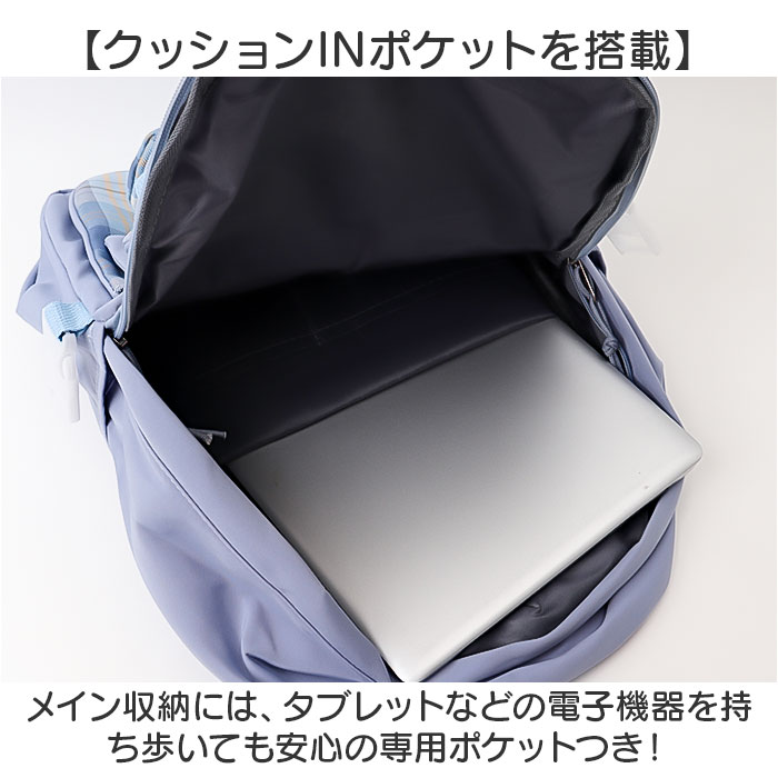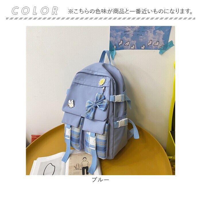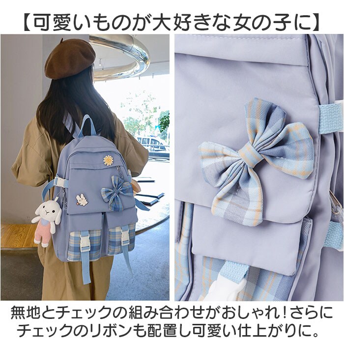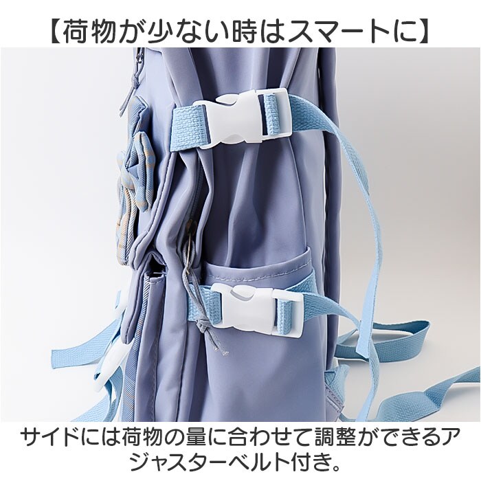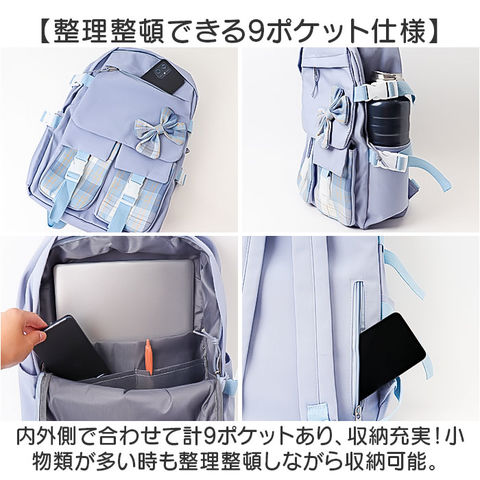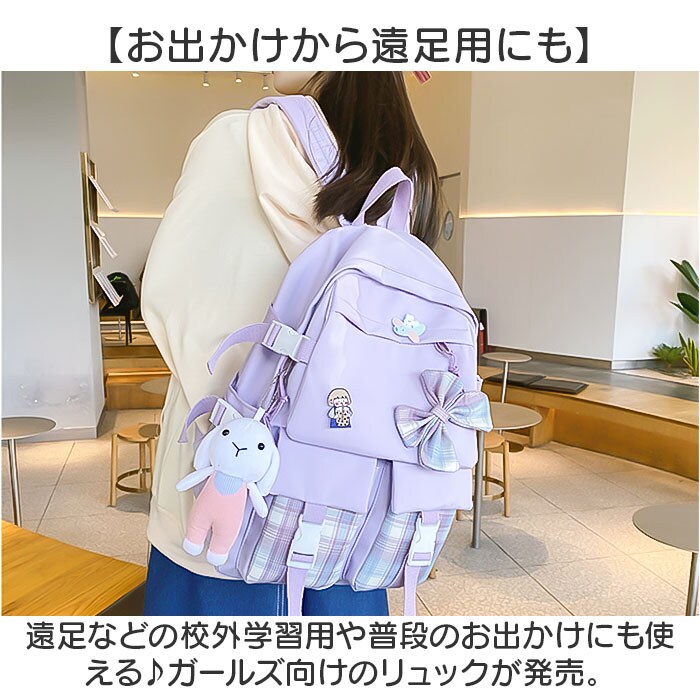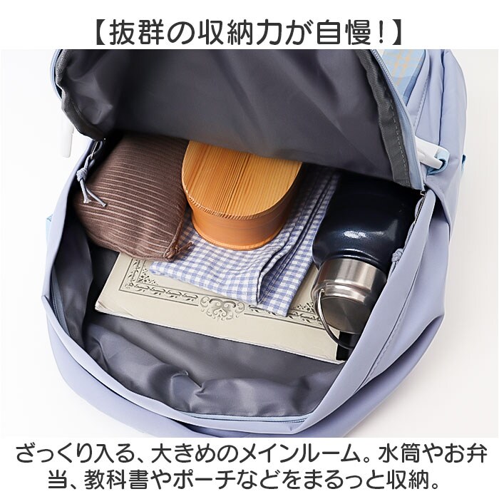 | 商品説明 | 【お出かけから遠足用にも】遠足などの校外学習用や普段のお出かけにも使える♪ガールズ向けのリュックが発売。【抜群の収納力が自慢!】ざっくり入る、大きめのメインルーム。水筒やお弁当、教科書やポーチなどをまるっと収納。【クッションINポケットを搭載】メイン収納には、タブレットなどの電子機器を持ち歩いても安心の専用ポケットつき!【整理整頓できる9ポケット仕様】内外側で合わせて計9ポケットあり、収納充実!小物類が多い時も整理整頓しながら収納可能。【荷物が少ない時はスマートに】サイドには荷物の量に合わせて調整ができるアジャスターベルト付き。【背負い心地快適】ショルダーベルトは程よいクッションいりで肩への負担を軽減。【お手入れ楽なはっ水】表面生地ははっ水機能で汚れや水滴が付きづらく、お手入れが楽な仕上がり。※(※)完全防水ではございません。【可愛いものが大好きな女の子に】無地とチェックの組み合わせがおしゃれ!さらにチェックのリボンも配置し可愛い仕上がりに。【ポケット仕様】メインルーム:PCポケット×1、オープンポケット×2フロント:ファスナーポケット×3背面:ファスナーポケット×1両サイド:オープンポケット×1ずつ |