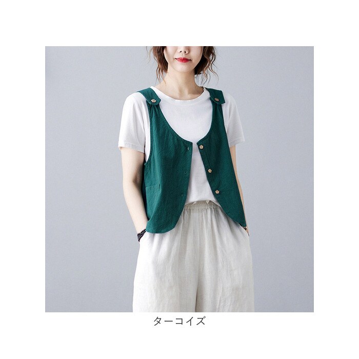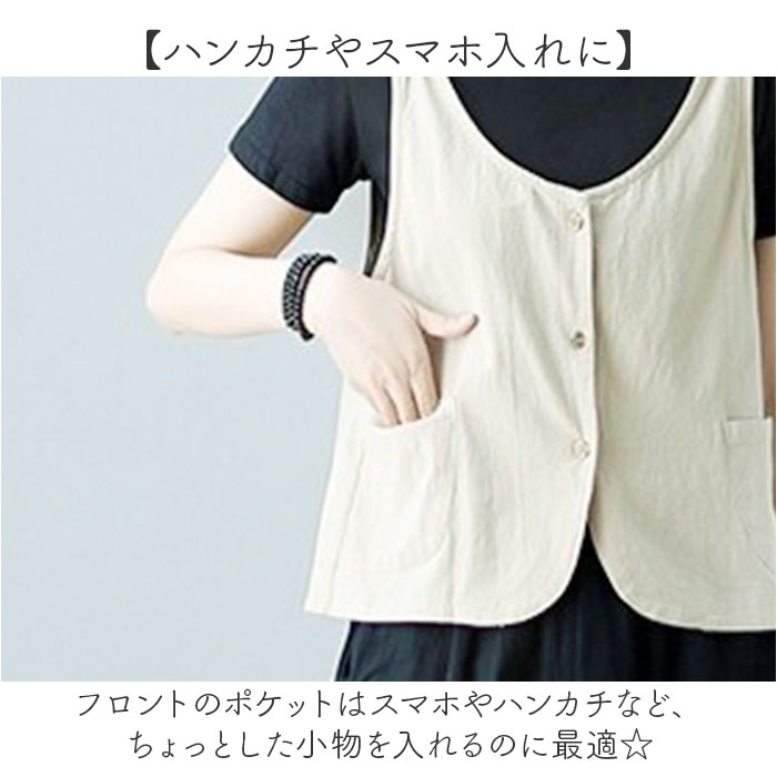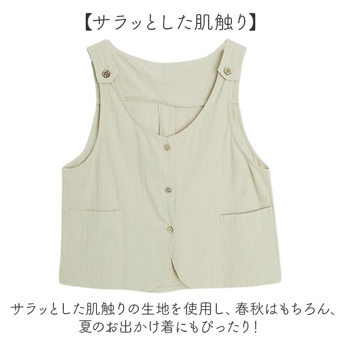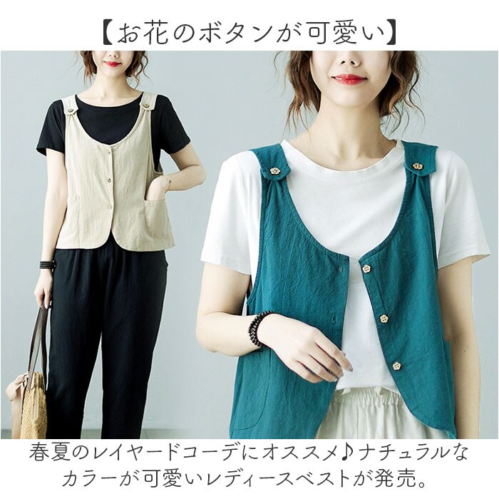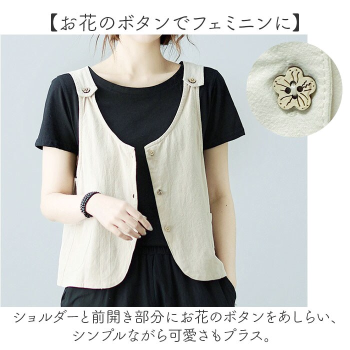 | 商品説明 | 【お花のボタンが可愛い】春夏のレイヤードコーデにオススメ♪ナチュラルなカラーが可愛いレディースベストが発売。【サラッとした肌触り】サラッとした肌触りの生地を使用し、春秋はもちろん、夏のお出かけ着にもぴったり!【お花のボタンでフェミニンに】ショルダーと前開き部分にお花のボタンをあしらい、シンプルながら可愛さもプラス。【カジュアルなレイヤードに】いつものブラウスやTシャツと合わせて、いつものコーデがより可愛くオシャレに♪【ボトムスも選ばない】すっきりとしたシルエットでスカートやパンツどちらのスタイルにも合う☆【ハンカチやスマホ入れに】フロントのポケットはスマホやハンカチなど、ちょっとした小物を入れるのに最適☆ |