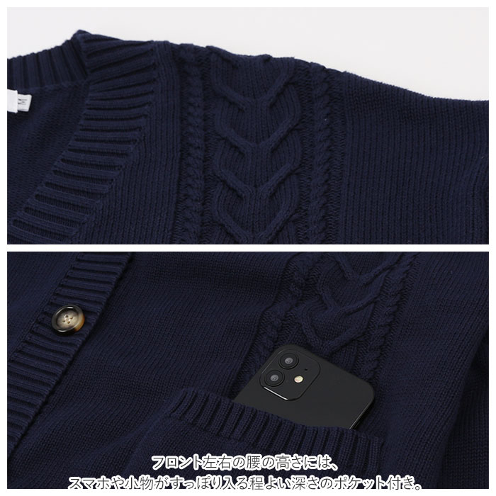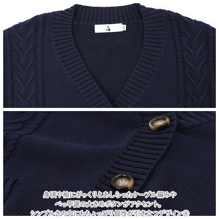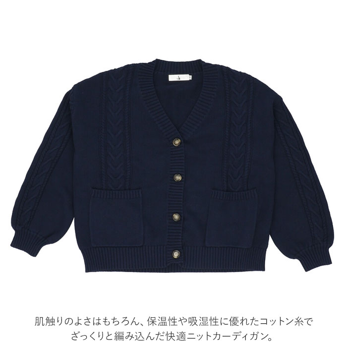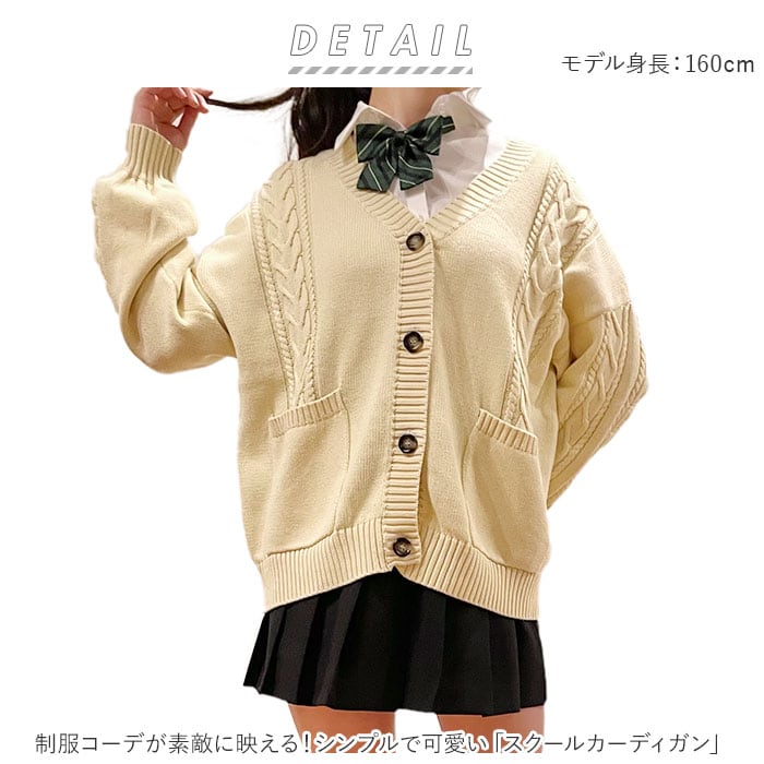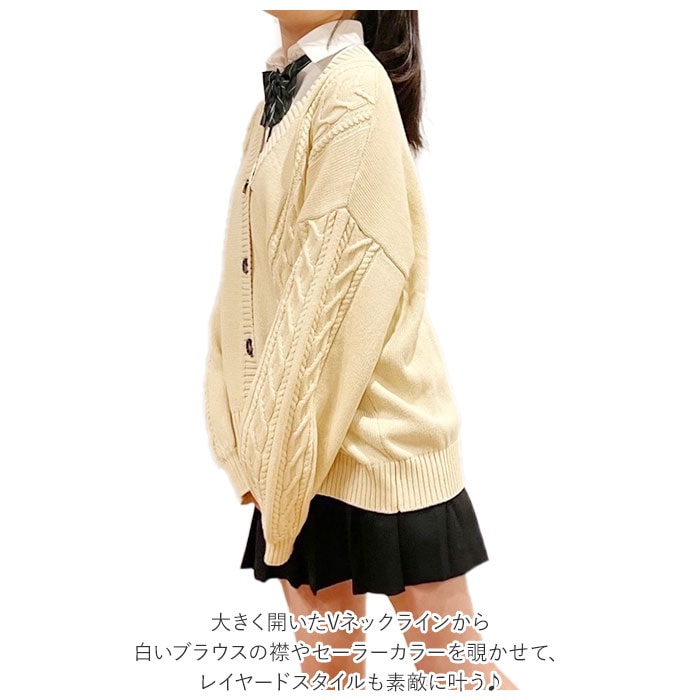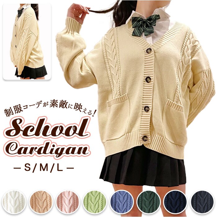 | 商品説明 | 制服コーデが素敵に映える!シンプルで可愛い「スクールカーディガン」肌触りのよさはもちろん、保温性や吸湿性に優れたコットン糸でざっくりと編み込んだ快適ニットカーディガン。身頃や袖にざっくりとあしらったケーブル編みやべっ甲調の大きめボタンがアクセント。シンプルさの中にもちょっぴり個性が引き立つデザイン◎大きく開いたVネックラインから白いブラウスの襟やセーラーカラーを覗かせて、レイヤードスタイルも素敵に叶う♪ドロップショルダー気味にゆるっと羽織れる、カチッとしすぎないシルエットがアフタースクールでも大活躍!フロント左右の腰の高さには、スマホや小物がすっぽり入る程よい深さのポケット付き。コットンニット素材なので、ご家庭でのお洗濯もOK!(※ドライクリーニングをお勧めいたします。ご家庭でのお手入れの際は、手洗いで優しくお洗濯してください。)豊富なカラーバリエーションで、コーディネート自在♪ベーシックカラーは男子の制服スタイルにもフィット! |