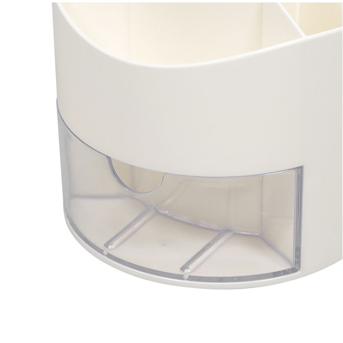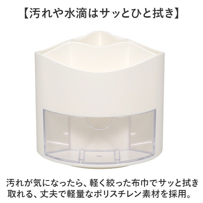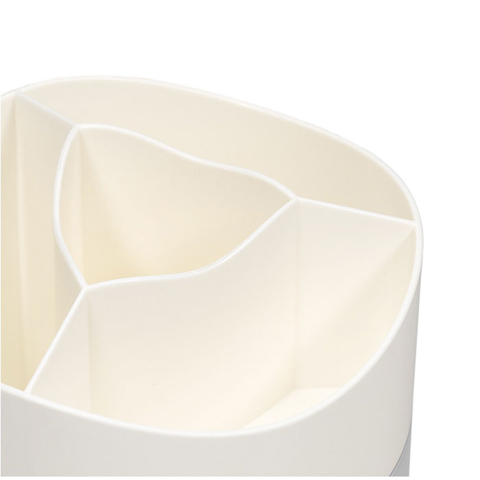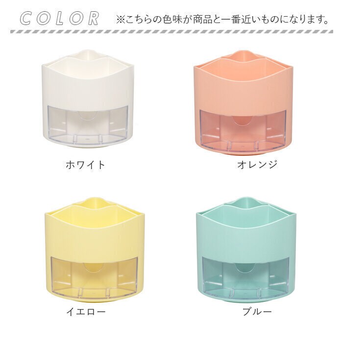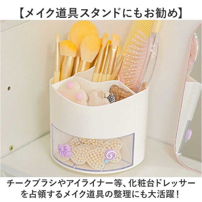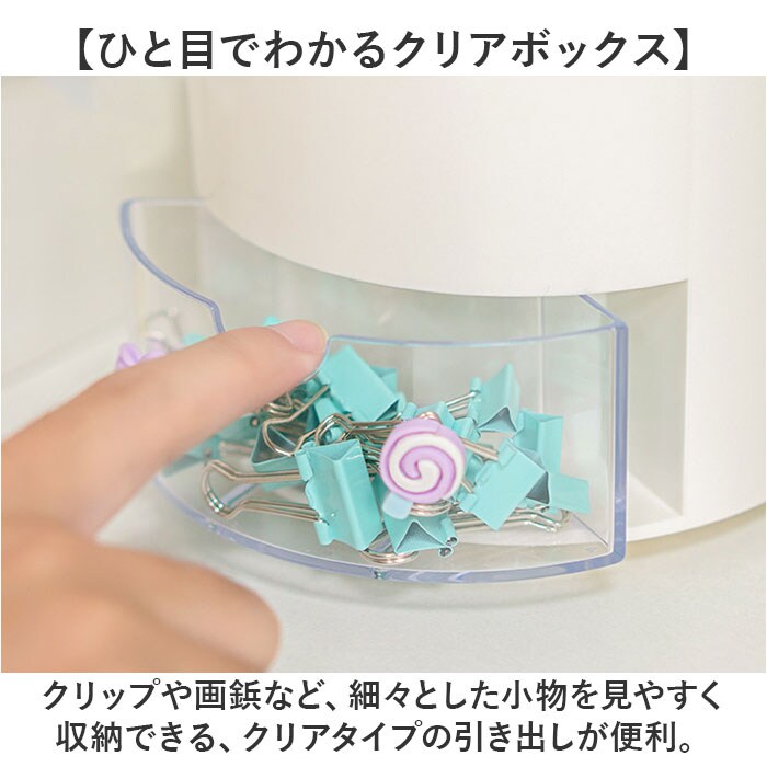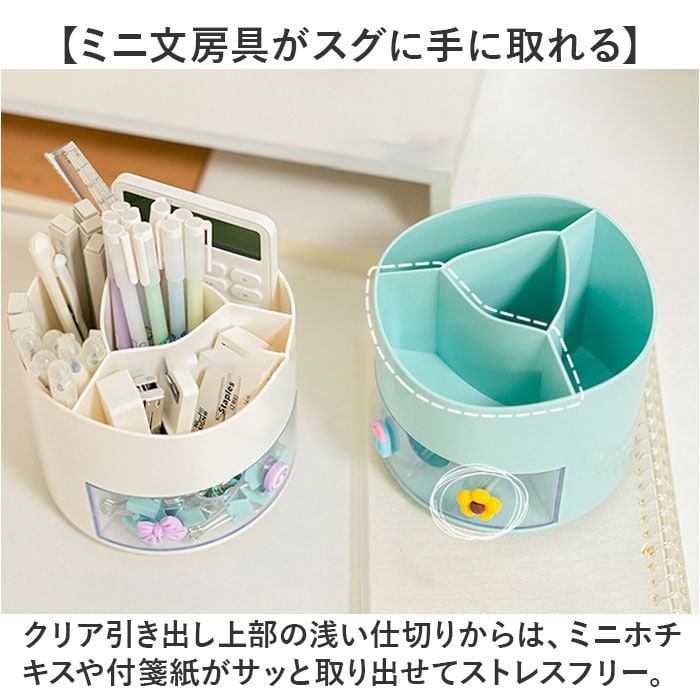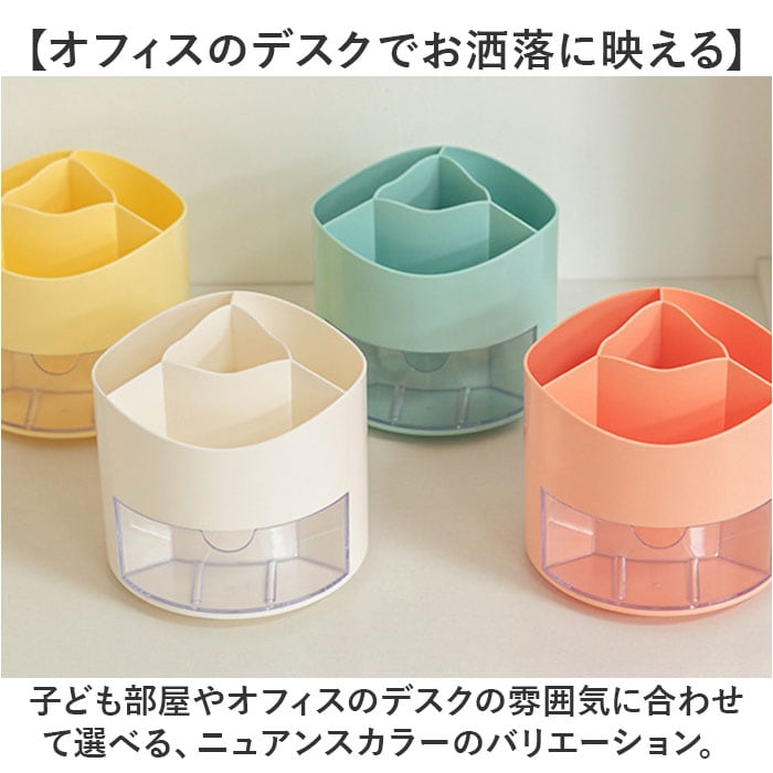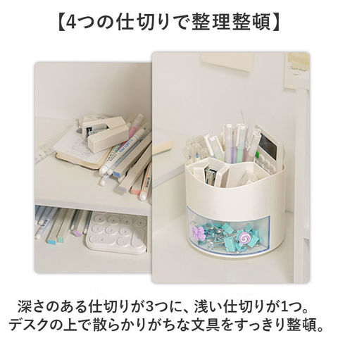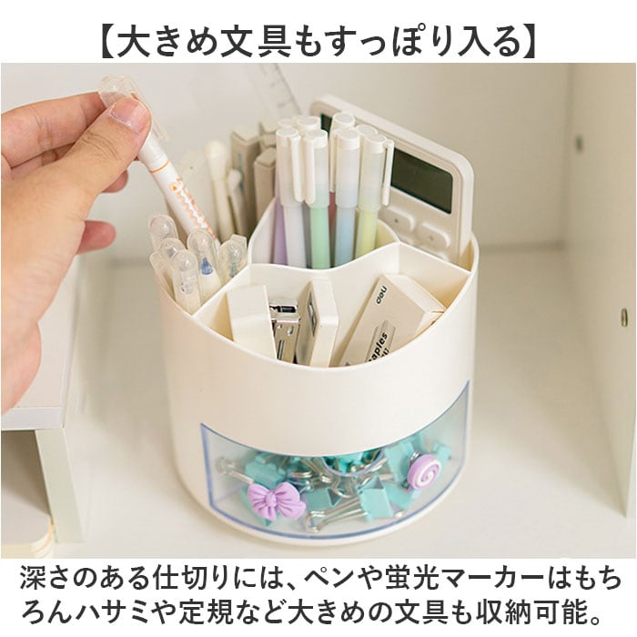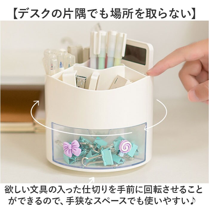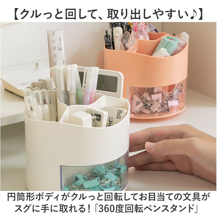 | 商品説明 | 【クルっと回して、取り出しやすい♪】円筒形ボディがクルっと回転してお目当ての文具がスグに手に取れる!「360度回転ペンスタンド」【4つの仕切りで整理整頓】深さのある仕切りが3つに、浅い仕切りが1つ。デスクの上で散らかりがちな文具をすっきり整頓。【デスクの片隅でも場所を取らない】欲しい文具の入った仕切りを手前に回転させることができるので、手狭なスペースでも使いやすい♪【大きめ文具もすっぽり入る】深さのある仕切りには、ペンや蛍光マーカーはもちろんハサミや定規など大きめの文具も収納可能。【ひと目でわかるクリアボックス】クリップや画鋲など、細々とした小物を見やすく収納できる、クリアタイプの引き出しが便利。【ミニ文房具がスグに手に取れる】クリア引き出し上部の浅い仕切りからは、ミニホチキスや付箋紙がサッと取り出せてストレスフリー。【汚れや水滴はサッとひと拭き】汚れが気になったら、軽く絞った布巾でサッと拭き取れる、丈夫で軽量なポリスチレン素材を採用。【メイク道具スタンドにもお勧め】チークブラシやアイライナー等、化粧台ドレッサーを占領するメイク道具の整理にも大活躍!【使い方はアイディア次第♪】スマホのちょい置きやメガネスタンド等、様々なシーンで自分らしく使えるのも嬉しいポイント。【オフィスのデスクでお洒落に映える】子ども部屋やオフィスのデスクの雰囲気に合わせて選べる、ニュアンスカラーのバリエーション。 |