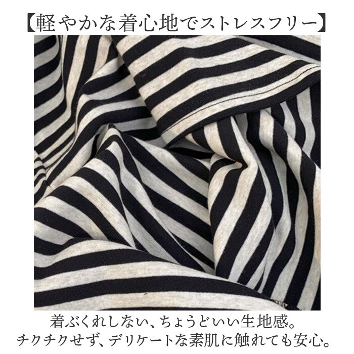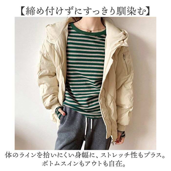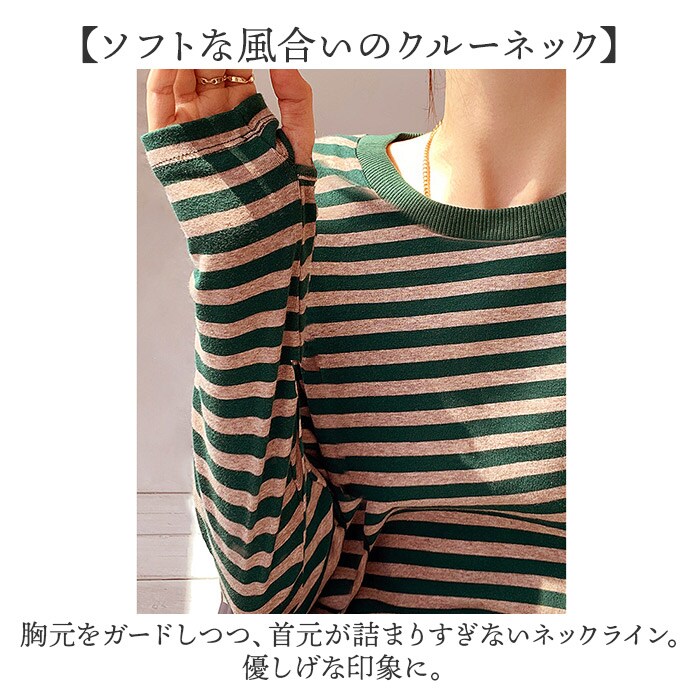 | 商品説明 | 【大人可愛いカジュアルスタイル】長めの袖と指穴がポイント!ヘビロテ間違いなしの「ボーダー カットソー」。【甲まですっぽり、アームカバーに】手の甲まで覆える長めの袖口に、親指が通せる穴付き。手元を防寒できるアームカバー代わり!【そっと覗かせてレイヤードスタイル】ニットなどの下に仕込んで、袖口だけちらり。簡単におしゃれ度アップ☆【もちろん1枚でラフな着こなしも】どんなボトムスとも相性が良く、エイジレスで使えるボーダー柄。気取らず着回し力抜群。【ソフトな風合いのクルーネック】胸元をガードしつつ、首元が詰まりすぎないネックライン。優しげな印象に。【軽やかな着心地でストレスフリー】着ぶくれしない、ちょうどいい生地感。チクチクせず、デリケートな素肌に触れても安心。【締め付けずにすっきり馴染む】体のラインを拾いにくい身幅に、ストレッチ性もプラス。ボトムスインもアウトも自在。 |