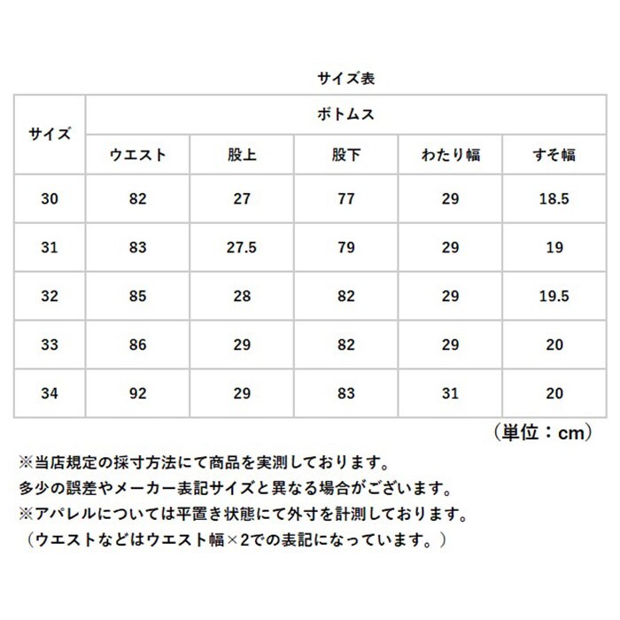 | サイズ | [メンズ] ・30サイズ ・31サイズ ・32サイズ ・33サイズ ・34サイズ ※サイズについて詳細は、商品画像の中にあるサイズ表をご覧くださいませ。 |