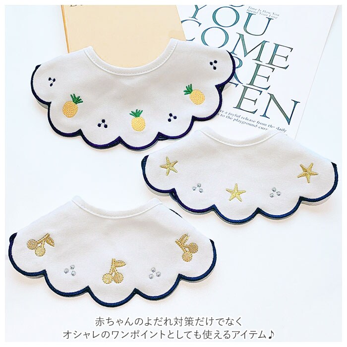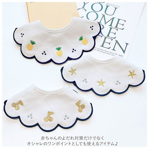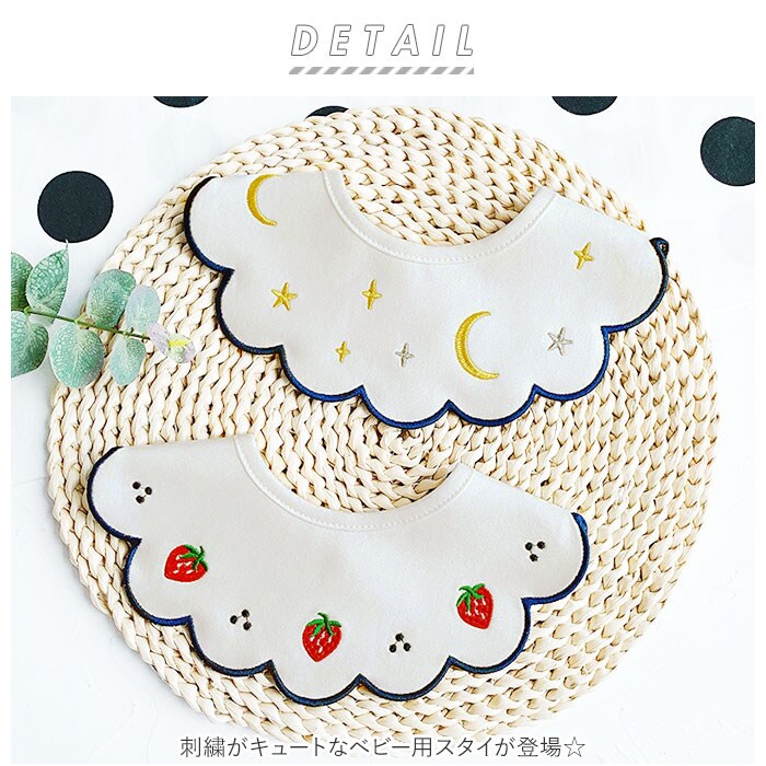 | 商品説明 | 刺繍がキュートなベビー用スタイが登場。シンプルなデザインなので、柄物のお洋服にもぴったり。全面使えて便利な丸形タイプ。汚れたら前後ひっくり返してつかえるのが嬉しい。スタイはスナップボタンで留める仕様!好奇心旺盛な赤ちゃんが自分でスタイをとってしまう心配を軽減できる。スナップボタンが2ヶ所あるので、首回りの長さに合わせてお好みのサイズを選べる。綿素材を使用していてお肌にも優しく、吸水性にも優れている◎赤ちゃんのよだれ対策だけでなく、オシャレのワンポイントとしても使えるアイテム♪ |