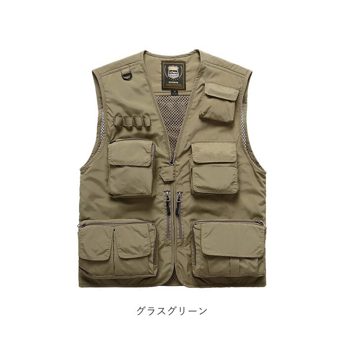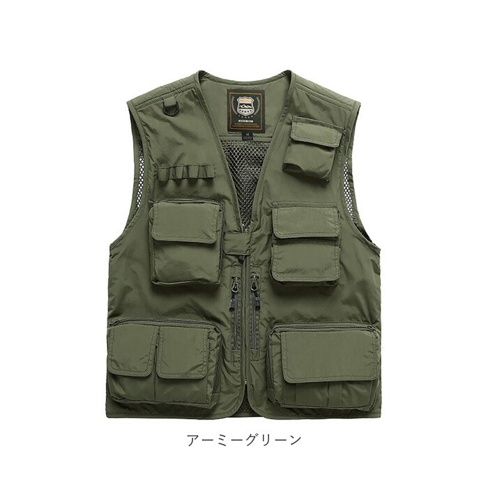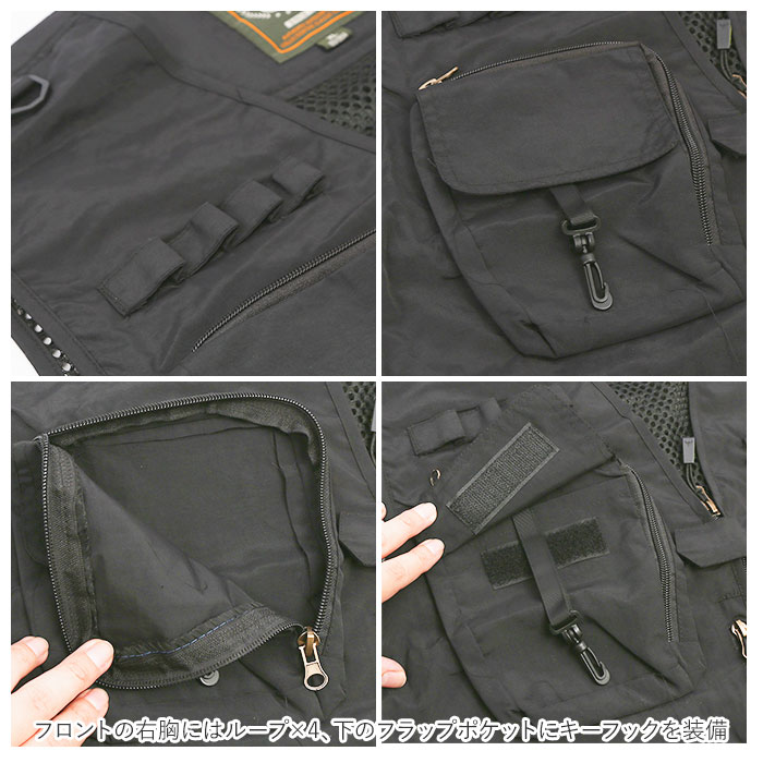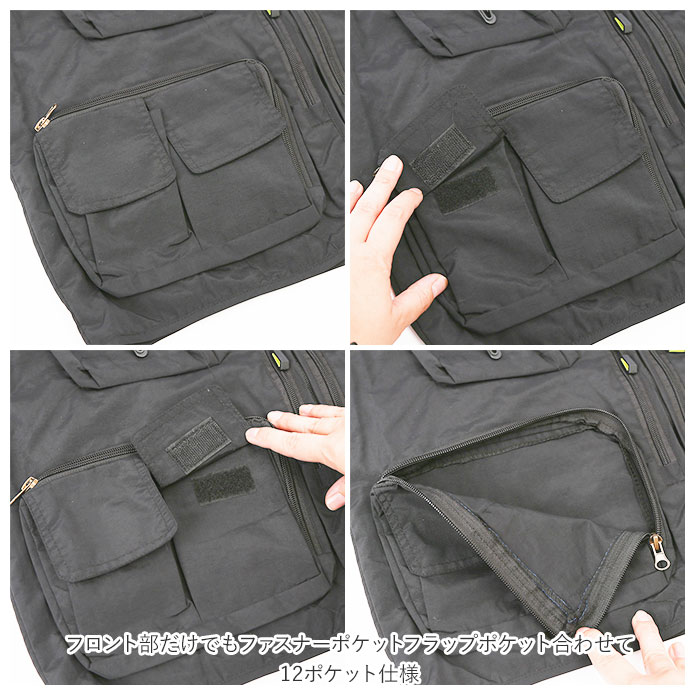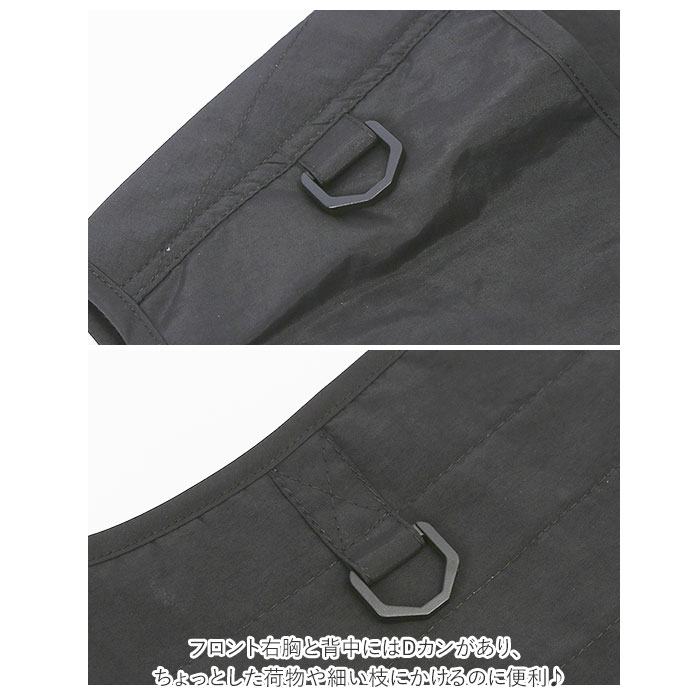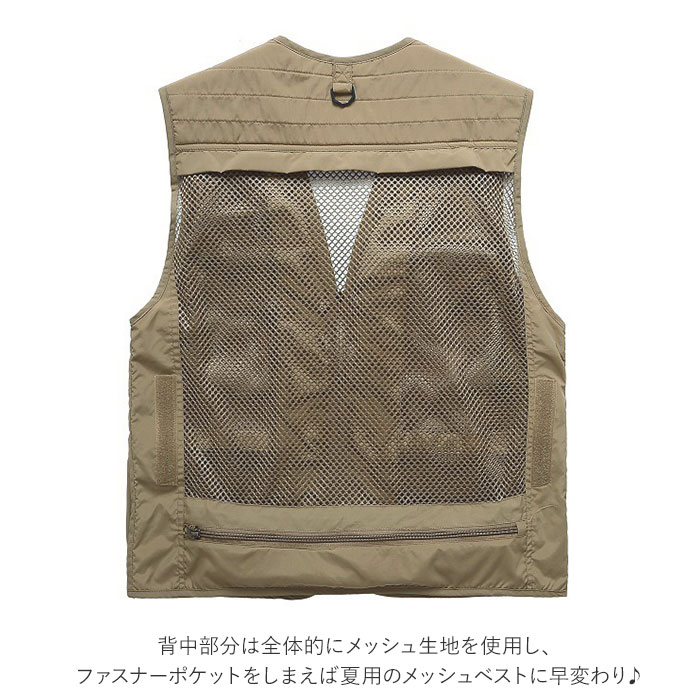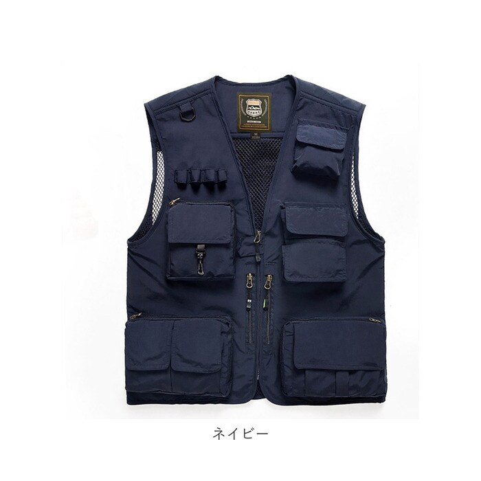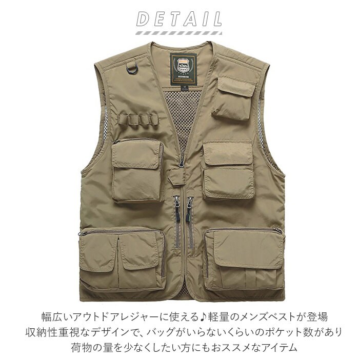 | 商品説明 | 幅広いアウトドアレジャーに使える♪軽量のメンズベストが登場。収納性重視なデザインで、バッグがいらないくらいのポケット数があり、荷物の量を少なくしたい方にもおススメなアイテム。フロントの右胸にはループ×4、下のフラップポケットにキーフックを装備。フロント部だけでもファスナーポケット、フラップポケット合わせて12ポケット仕様。背面に大きなファスナーポケットを装備。使わない時はクルクル丸めて裾のファスナーポケットに収納可能。背中部分は全体的にメッシュ生地を使用し、ファスナーポケットをしまえば夏用のメッシュベストに早変わり♪フロント右胸と背中にはDカンがあり、ちょっとした荷物や細い枝にかけるのに便利♪フロント部の裏地もメッシュ素材だから通気性抜群!内側の面ファスナーで開閉できるオープンポケット付き。薄手な生地感でアウターとしてや、上にコートやジャケットなどを羽織っても動きやすいのもポイント。 |