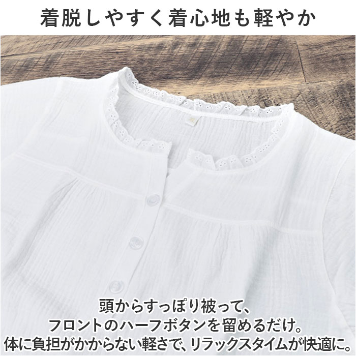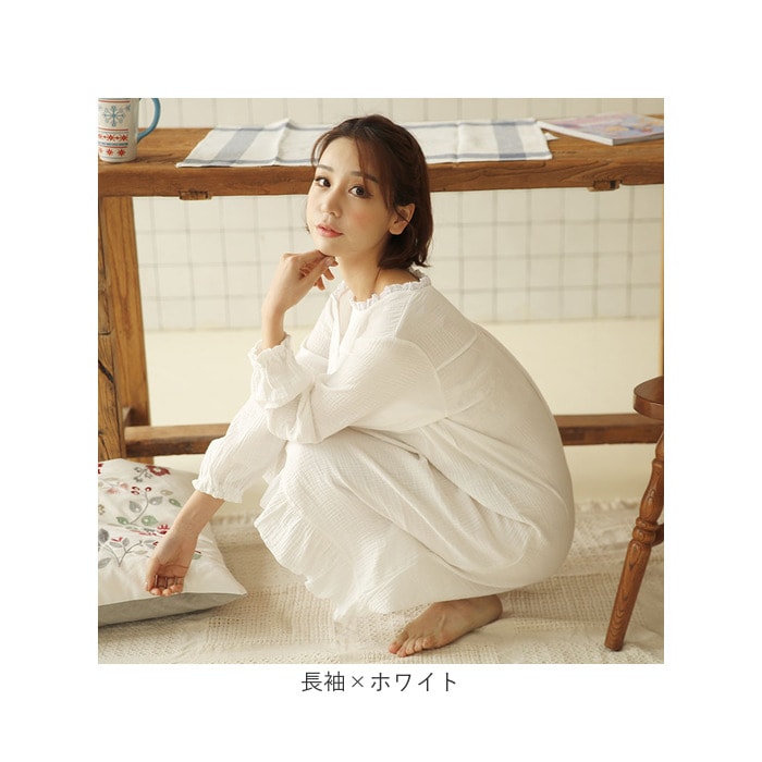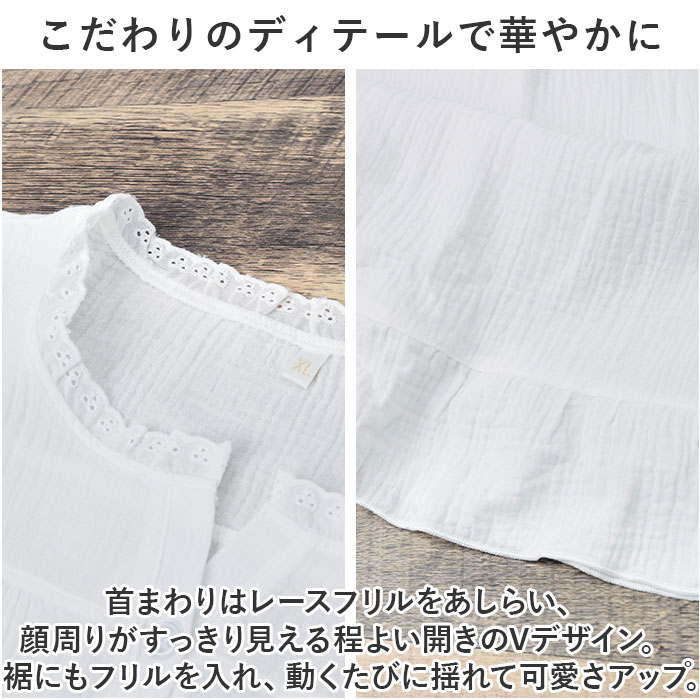 | 商品説明 | お家の中でも可愛くいたい女性にぴったり!ワンピースタイプのパジャマが新登場。【ふんわり優しいガーリー感♪】ナチュラルカラーにレースやフリルをプラスし、大人可愛い印象に仕上げたアイテム。【着脱しやすく着心地も軽やか】頭からすっぽり被って、フロントのハーフボタンを留めるだけ。体に負担がかからない軽さで、リラックスタイムが快適に。【柔らかくお肌に馴染むコットン素材】チクチクせず、お肌を傷つける心配のないコットン素材。吸水性に優れており、汗ばむ季節もいや~なムレを軽減。【締め付けのないゆるっとフォルム】体のラインを拾いにくい、身幅に余裕を持たせたシルエット。足さばきも良く、動きを妨げない!【こだわりのディテールで華やかに】首まわりはレースフリルをあしらい、顔周りがすっきり見える程よい開きのVデザイン。裾にもフリルを入れ、動くたびに揺れて可愛さアップ。【季節に合わせて選べる2タイプ】半袖と長袖の2タイプをご用意。季節やお好みで選べるのが嬉しい!【家事や身支度もストレスフリー】袖口はゴムの入ったフリルデザイン。長袖でも腕まくりしやすく、洗い物や洗顔時にも便利。 |