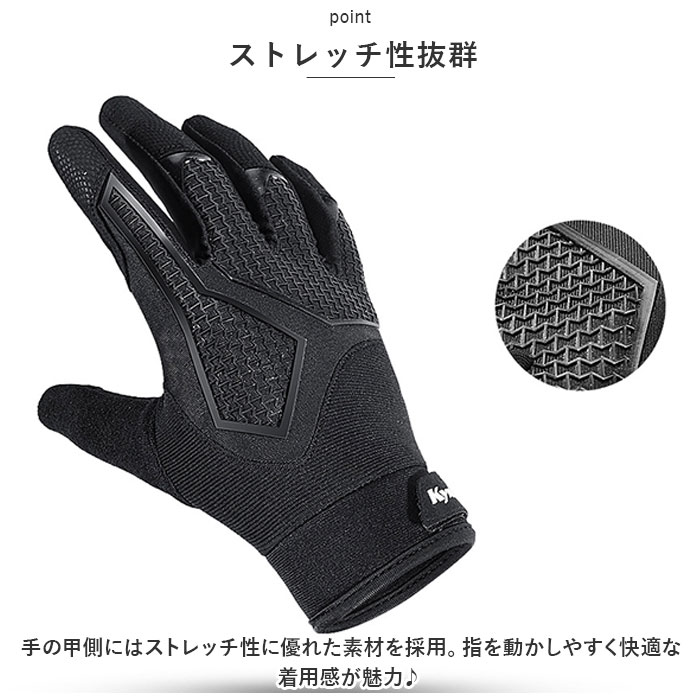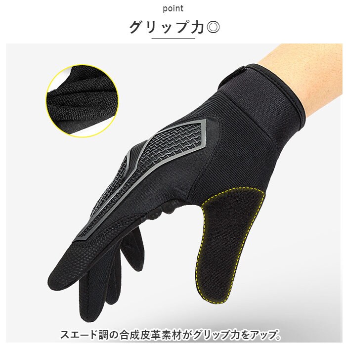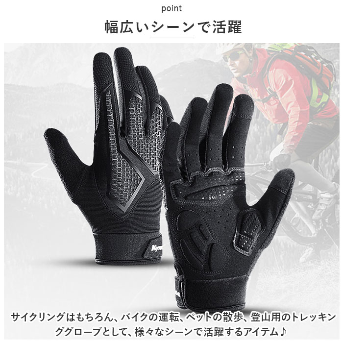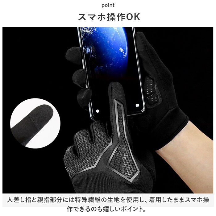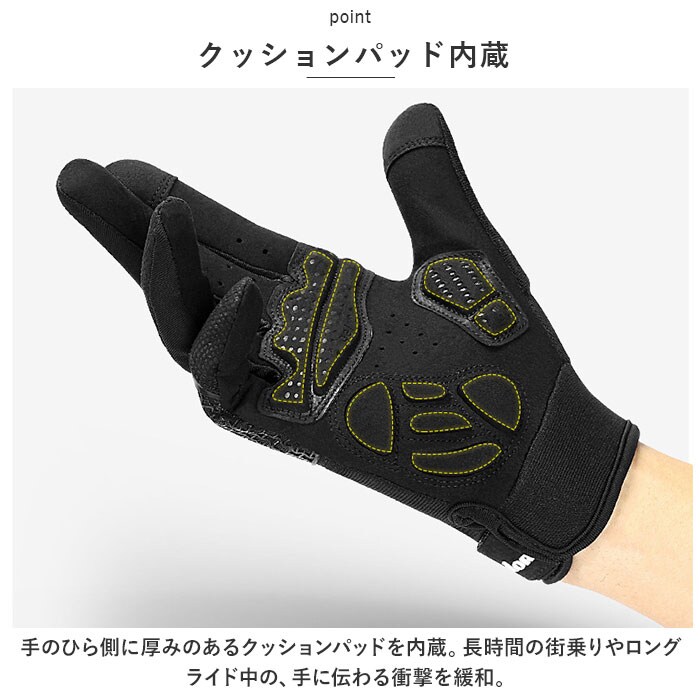 | 商品説明 | サイクリングを快適にサポートするサイクルグローブが新登場!【クッションパッド内蔵】手のひら側に厚みのあるクッションパッドを内蔵。長時間の街乗りやロングライド中の、手に伝わる衝撃を緩和。【ストレッチ性抜群】手の甲側にはストレッチ性に優れた素材を採用。指を動かしやすく快適な着用感が魅力♪【スマホ操作OK】人差し指と親指部分には特殊繊維の生地を使用し、着用したままスマホ操作できるのも嬉しいポイント。【グリップ力◎】スエード調の合成皮革素材がグリップ力をアップ。【通気性アリ!】随所に小さなホールを開けることで、蒸れにくい仕様に。汗をかくスポーツシーンにもおススメ♪【手首のフィット感調節】手首に配した面ファスナーで、ご自身のサイズに合わせて装着具合の調節が可能。【幅広いシーンで活躍】サイクリングはもちろん、バイクの運転、ペットの散歩、登山用のトレッキンググローブとして、様々なシーンで活躍するアイテム♪ |