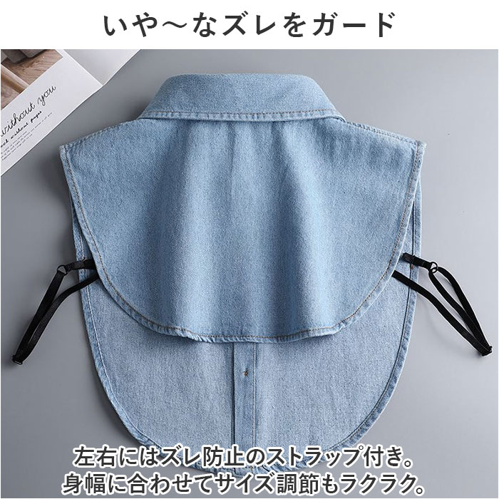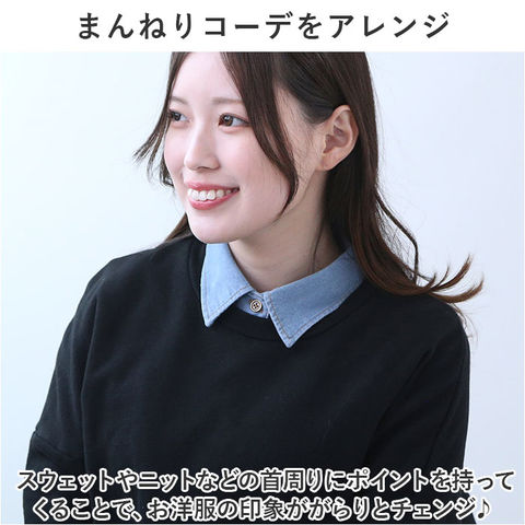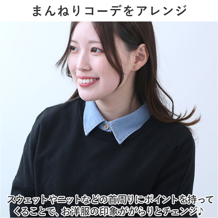 | 商品説明 | 毎日のおしゃれがもっと楽しくなる♪いつものコーデにプラスできる「付け襟」が登場。【まんねりコーデをアレンジ】スウェットやニットなどの首周りにポイントを持ってくることで、お洋服の印象ががらりとチェンジ♪【手軽にレイヤードを楽しめる♪】着脱しやすいフロントボタン仕様。腕を通してシャツのように着て忍ばせるだけ。【いや~なズレをガード】左右にはズレ防止のストラップ付き。身幅に合わせてサイズ調節もラクラク。【着ぶくれ感なくストレスフリー】薄手の生地感なので、トップスの下に身につけても着ぶくれの心配不要。【デニムでカジュアル感アップ】デニムはカジュアルコーデの定番☆シンプルなトップスにマッチし、流行を気にせず楽しめるのが嬉しい!【お好みで選べる2タイプ】スタンダードとラウンドの2タイプ。お気に入りを選ぶも良し、どちらも揃えて使い分けもOK。 |