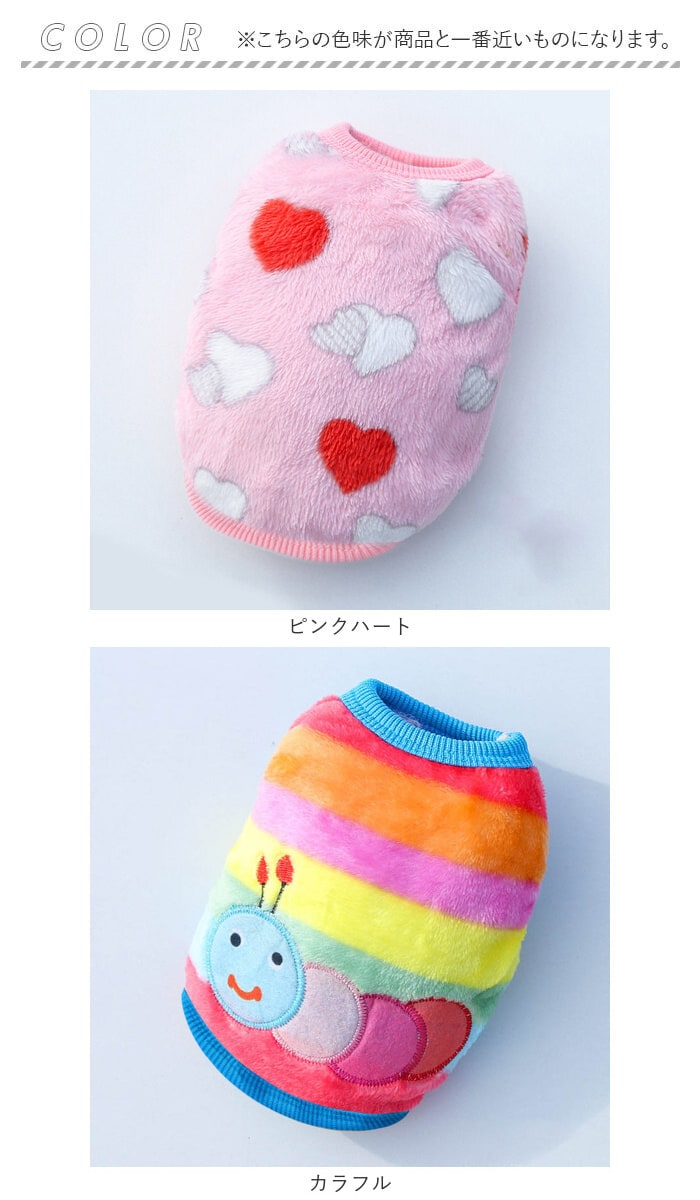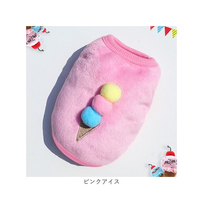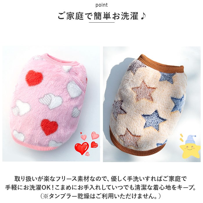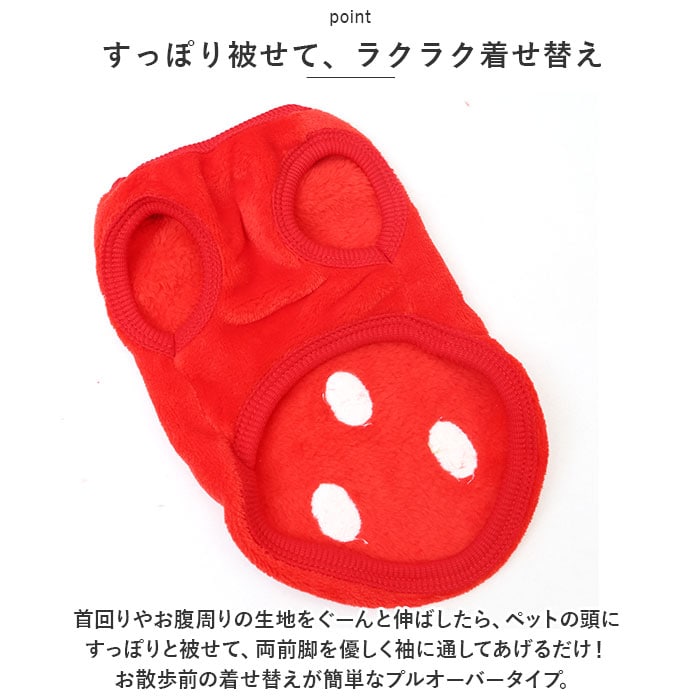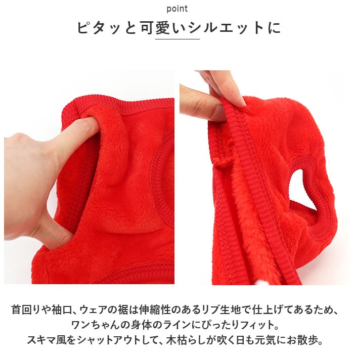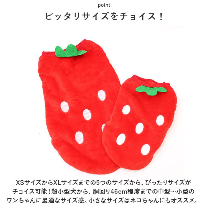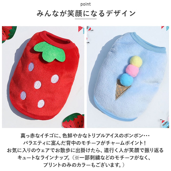 | 商品説明 | ぽかぽかウェアに着替えたら、ご家族みんながほっこり笑顔に♪背中のモチーフが可愛らしい「防寒ペットウェア」が新登場!【ふんわり着せて、優しく防寒】ウェアの表生地はベルベッドのように滑らかなフリース素材、裏側はもこもことした毛足が気持ちよいボア生地仕上げ。ウェア内側の暖かな空気をキープして、薄手なのに肌寒い季節でもぽかぽかと快適な着心地。【すっぽり被せて、ラクラク着せ替え】首回りやお腹周りの生地をぐーんと伸ばしたら、ペットの頭にすっぽりと被せて、両前脚を優しく袖に通してあげるだけ!お散歩前の着せ替えが簡単なプルオーバータイプ。【ピタッと可愛いシルエットに】首回りや袖口、ウェアの裾は伸縮性のあるリブ生地で仕上げてあるため、ワンちゃんの身体のラインにぴったりフィット。スキマ風をシャットアウトして、木枯らしが吹く日も元気にお散歩。【おトイレの時も安心】お腹まわりやお尻は大きく開いたデザインなので、おトイレでウェアの生地を汚す心配がないのも嬉しいポイント!【ご家庭で簡単お洗濯♪】取り扱いが楽なフリース素材なので、優しく手洗いすればご家庭で手軽にお洗濯OK!こまめにお手入れしていつでも清潔な着心地をキープ。(※タンブラー乾燥はご利用いただけません。)【ピッタリサイズをチョイス!】XSサイズからXLサイズまでの5つのサイズから、ぴったりサイズがチョイス可能!超小型犬から、胴回り46cm程度までの中型~小型のワンちゃんに最適なサイズ感。小さなサイズはネコちゃんにもオススメ。【みんなが笑顔になるデザイン】真っ赤なイチゴに、色鮮やかなトリプルアイスのポンポン・・・バラエティに富んだ背中のモチーフがチャームポイント!お気に入りのウェアでお散歩に出掛けたら、道行く人が笑顔で振り返るキュートなラインナップ。(※一部刺繍などのモチーフがなく、プリントのみのカラーもございます。)【ルームウェアにも◎】肌寒さが気になる季節のお散歩用ウェアとしてはもちろん、ルームウェアやパジャマとして、朝晩の冷え込み対策にもオススメ。 |