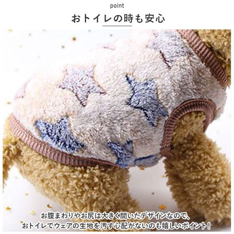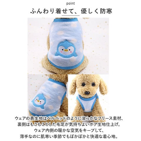 | 商品説明 | ぽかぽかウェアに着替えたら、ご家族みんながほっこり笑顔に♪背中のモチーフが可愛らしい「防寒ペットウェア」が新登場!【ふんわり着せて、優しく防寒】ウェアの表生地はベルベッドのように滑らかなフリース素材、裏側はもこもことした毛足が気持ちよいボア生地仕上げ。ウェア内側の暖かな空気をキープして、薄手なのに肌寒い季節でもぽかぽかと快適な着心地。【すっぽり被せて、ラクラク着せ替え】首回りやお腹周りの生地をぐーんと伸ばしたら、ペットの頭にすっぽりと被せて、両前脚を優しく袖に通してあげるだけ!お散歩前の着せ替えが簡単なプルオーバータイプ。【ピタッと可愛いシルエットに】首回りや袖口、ウェアの裾は伸縮性のあるリブ生地で仕上げてあるため、ワンちゃんの身体のラインにぴったりフィット。スキマ風をシャットアウトして、木枯らしが吹く日も元気にお散歩。【おトイレの時も安心】お腹まわりやお尻は大きく開いたデザインなので、おトイレでウェアの生地を汚す心配がないのも嬉しいポイント!【ご家庭で簡単お洗濯♪】取り扱いが楽なフリース素材なので、優しく手洗いすればご家庭で手軽にお洗濯OK!こまめにお手入れしていつでも清潔な着心地をキープ。(※タンブラー乾燥はご利用いただけません。)【ピッタリサイズをチョイス!】XSサイズからXLサイズまでの5つのサイズから、ぴったりサイズがチョイス可能!超小型犬から、胴回り46cm程度までの中型~小型のワンちゃんに最適なサイズ感。小さなサイズはネコちゃんにもオススメ。【みんなが笑顔になるデザイン】真っ赤なイチゴに、色鮮やかなトリプルアイスのポンポン・・・バラエティに富んだ背中のモチーフがチャームポイント!お気に入りのウェアでお散歩に出掛けたら、道行く人が笑顔で振り返るキュートなラインナップ。(※一部刺繍などのモチーフがなく、プリントのみのカラーもございます。)【ルームウェアにも◎】肌寒さが気になる季節のお散歩用ウェアとしてはもちろん、ルームウェアやパジャマとして、朝晩の冷え込み対策にもオススメ。 |