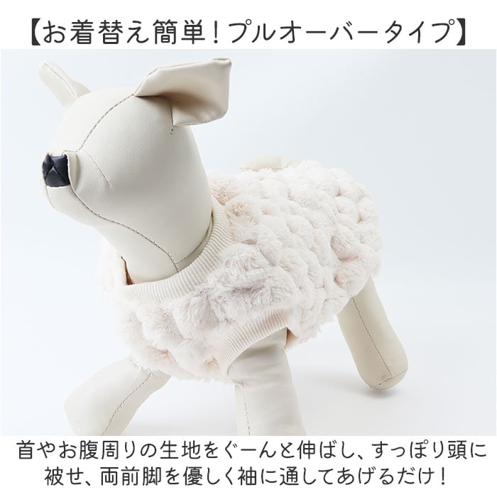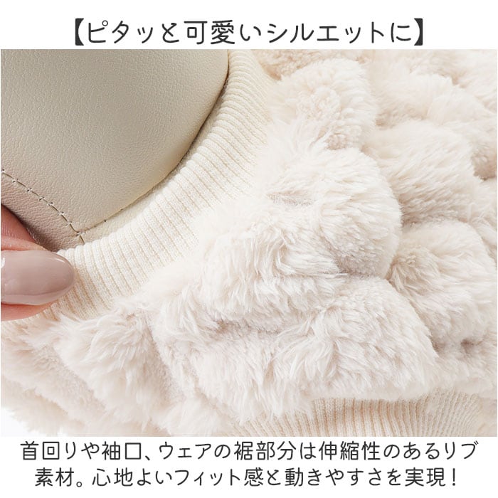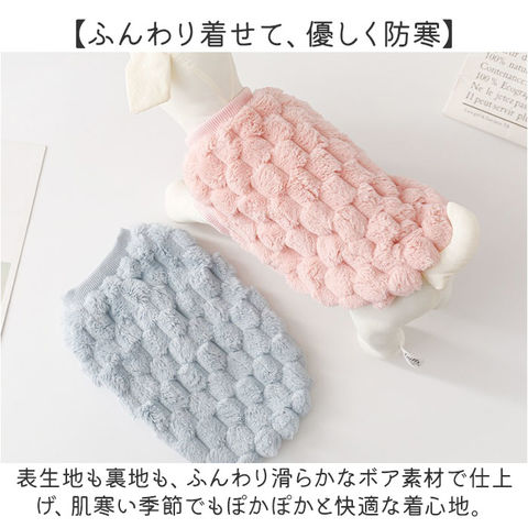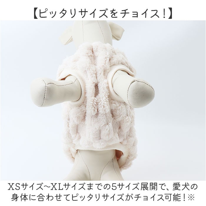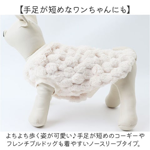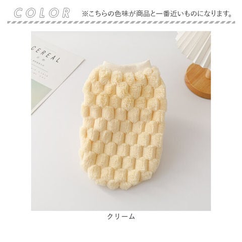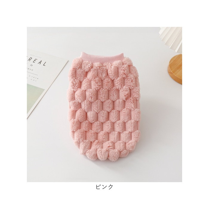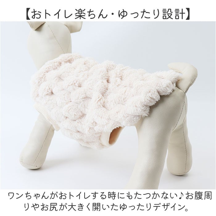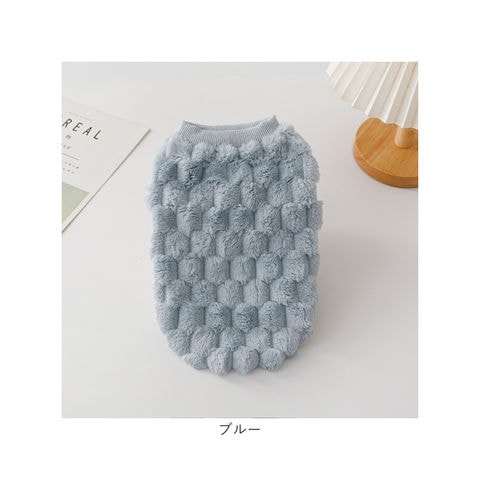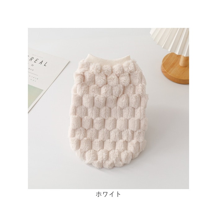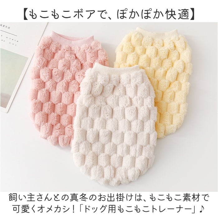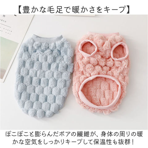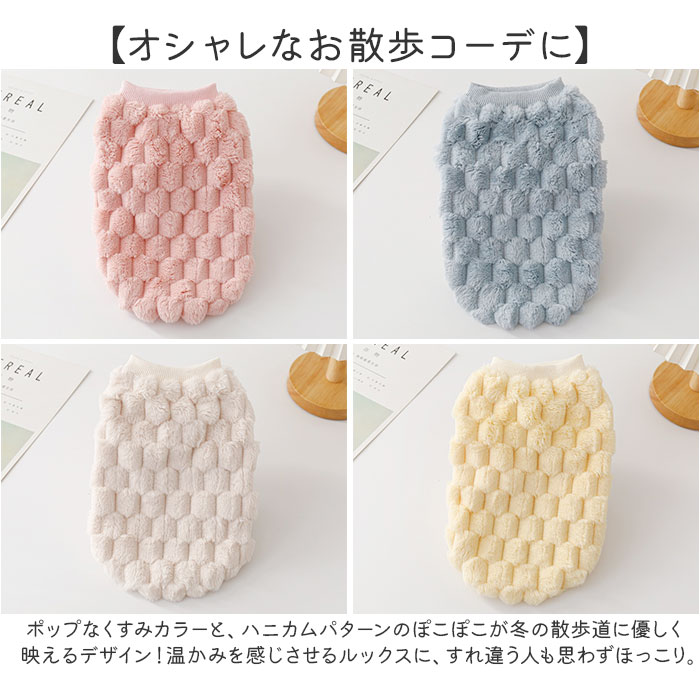 | 商品説明 | 【もこもこボアで、ぽかぽか快適】飼い主さんとの真冬のお出掛けは、もこもこ素材で可愛くオメカシ!「ドッグ用もこもこトレーナー」♪【ふんわり着せて、優しく防寒】表生地も裏地も、ふんわり滑らかなボア素材で仕上げ、肌寒い季節でもぽかぽかと快適な着心地。【豊かな毛足で暖かさをキープ】ぽこぽこと膨らんだボアの繊維が、身体の周りの暖かな空気をしっかりキープして保温性も抜群!【お着替え簡単!プルオーバータイプ】首やお腹周りの生地をぐーんと伸ばし、すっぽり頭に被せ、両前脚を優しく袖に通してあげるだけ!【ピタッと可愛いシルエットに】首回りや袖口、ウェアの裾部分は伸縮性のあるリブ素材。心地よいフィット感と動きやすさを実現!【手足が短めなワンちゃんにも】よちよち歩く姿が可愛い♪手足が短めのコーギーやフレンチブルドッグも着やすいノースリーブタイプ。【おトイレ楽ちん・ゆったり設計】ワンちゃんがおトイレする時にもたつかない♪お腹周りやお尻が大きく開いたゆったりデザイン。【ご家庭でカンタンお洗濯♪】取り扱いの楽なポリエステル素材なので手軽にお洗濯OK!こまめなお洗濯でいつでも清潔な着心地。【ピッタリサイズをチョイス!】XSサイズ~XLサイズまでの5サイズ展開で、愛犬の身体に合わせてピッタリサイズがチョイス可能!※超小型犬から、胴回り48cm程度までの中型のワンちゃんに最適なサイズ感です。小さなサイズはネコちゃんにもオススメ。【オシャレなお散歩コーデに】ポップなくすみカラーと、ハニカムパターンのぽこぽこが冬の散歩道に優しく映えるデザイン!温かみを感じさせるルックスに、すれ違う人も思わずほっこり。【朝晩の冷え込み対策にもピッタリ】秋冬時期のお散歩ウェアとしてはもちろん、ルームウェアとして、肌寒い季節の冷え込み対策に! |