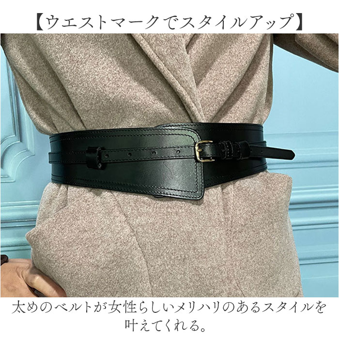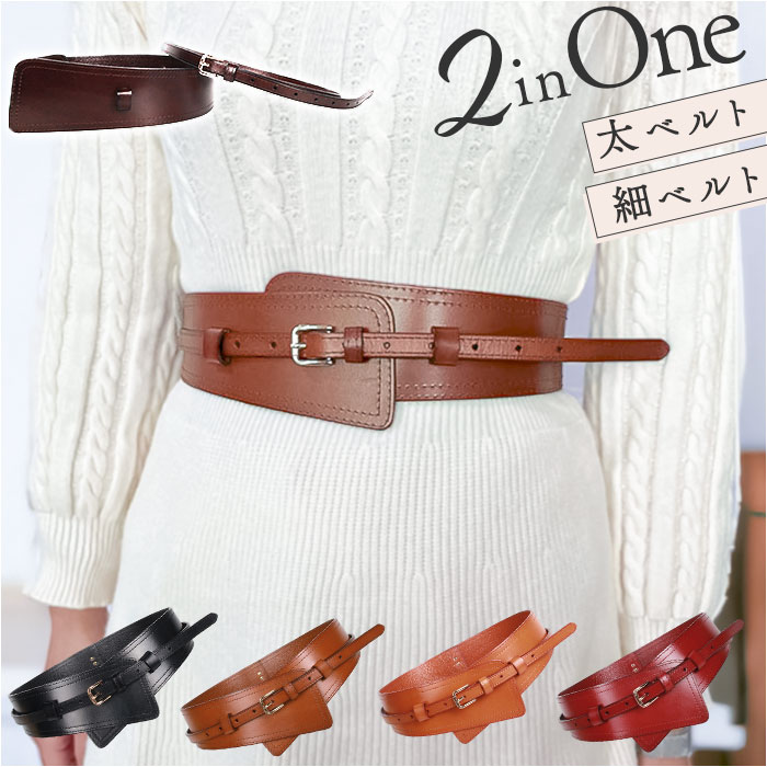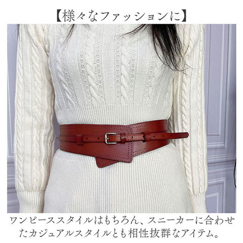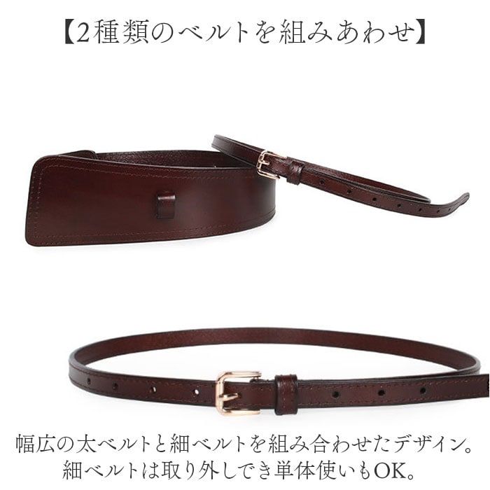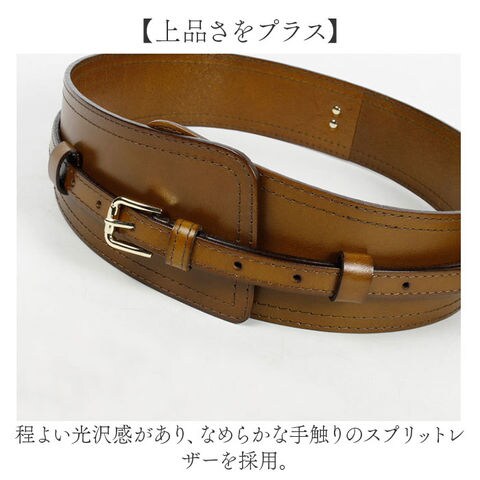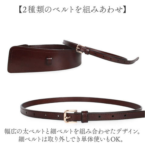 | 商品説明 | 【コーデのアクセントに♪】シンプルながらも存在感たっぷりなワイドベルトが登場。【2種類のベルトを組みあわせ】幅広の太ベルトと細ベルトを組み合わせたデザイン。細ベルトは取り外しでき単体使いもOK。【上品さをプラス】程よい光沢感があり、なめらかな手触りのスプリットレザーを採用。【ウエストマークでスタイルアップ】太めのベルトが女性らしいメリハリのあるスタイルを叶えてくれる。【様々なファッションに】ワンピーススタイルはもちろん、スニーカーに合わせたカジュアルスタイルとも相性抜群なアイテム。 |