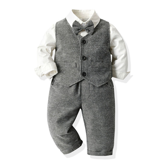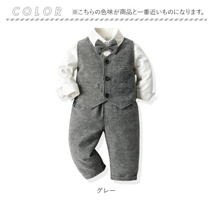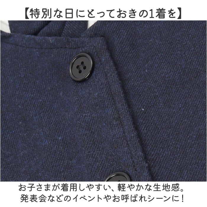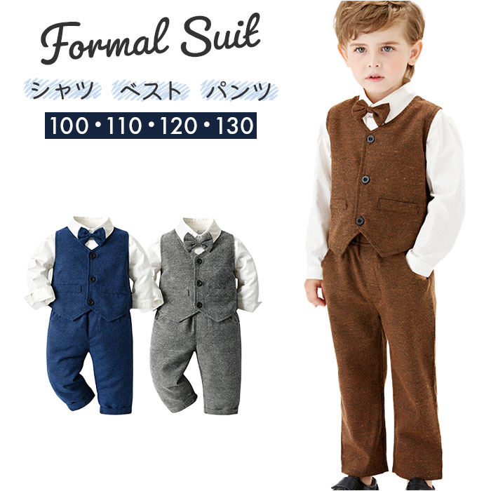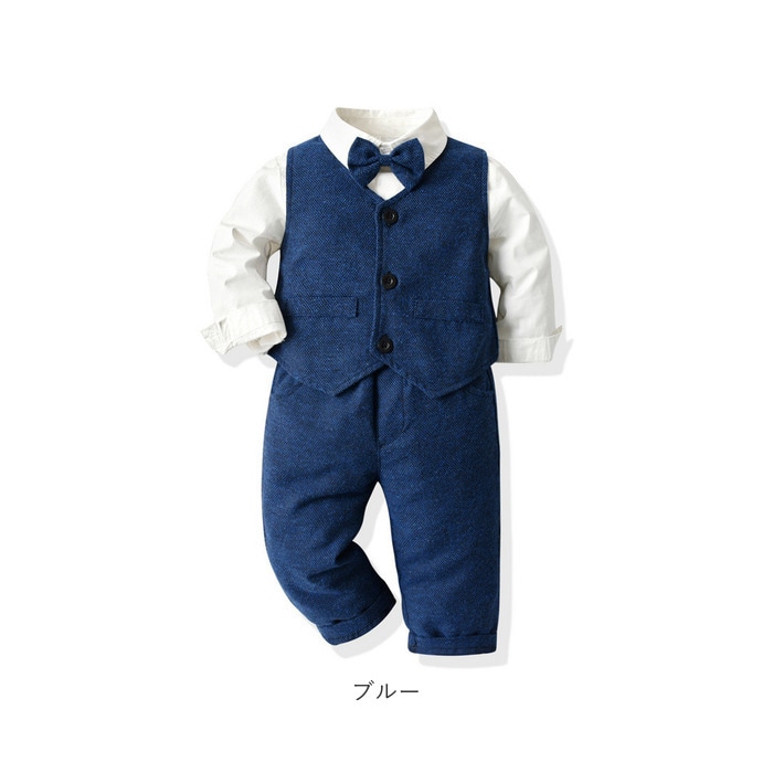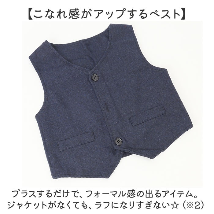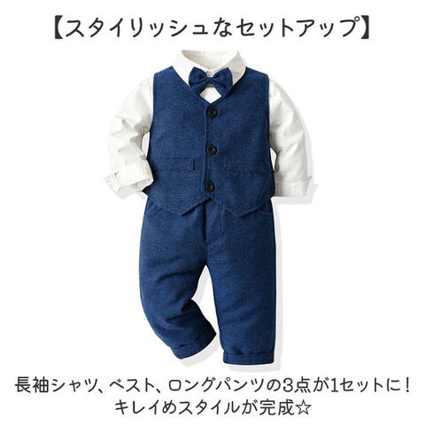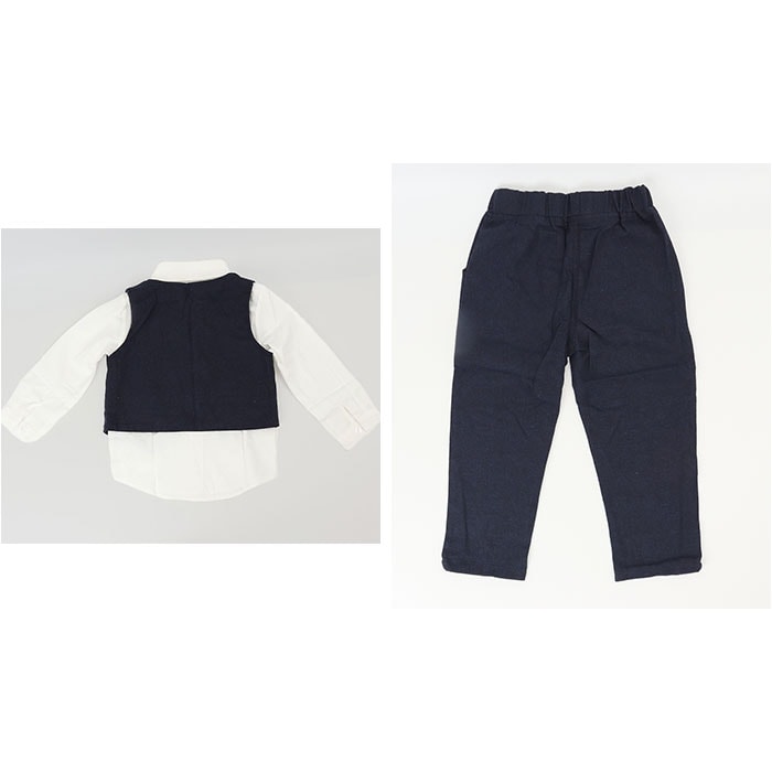 | 商品説明 | 【大人顔負けのかっこいいスタイル☆】コーデに悩まずおしゃれにキマる! 男の子用「フォーマルスーツ」3点セット。【スタイリッシュなセットアップ】長袖シャツ、ベスト、ロングパンツの3点が1セットに!キレイめスタイルが完成☆【ベーシックなホワイトシャツ】フロントボタン付きの、スタンダードなカタチに仕立てたシャツ。襟元には蝶ネクタイ付き。(※1)蝶ネクタイは縫い付けられています。【こなれ感がアップするベスト】プラスするだけで、フォーマル感の出るアイテム。ジャケットがなくても、ラフになりすぎない☆(※2)ポケットはフェイクです。【ストレスなく履けるパンツ】締めつけ感の少ないウエストゴム仕様で、着脱もスムーズ。左右にポケット付き。【特別な日にとっておきの1着を】お子さまが着用しやすい、軽やかな生地感。発表会などのイベントやお呼ばれシーンに! |