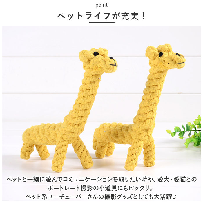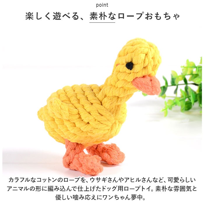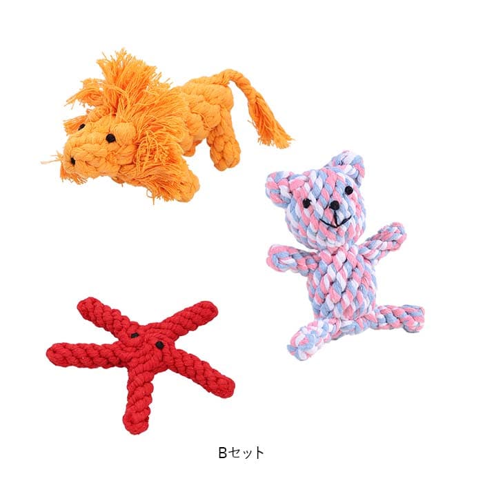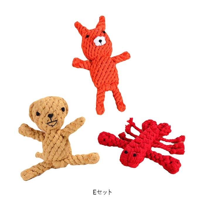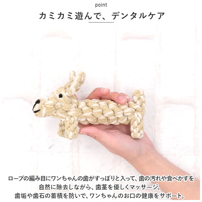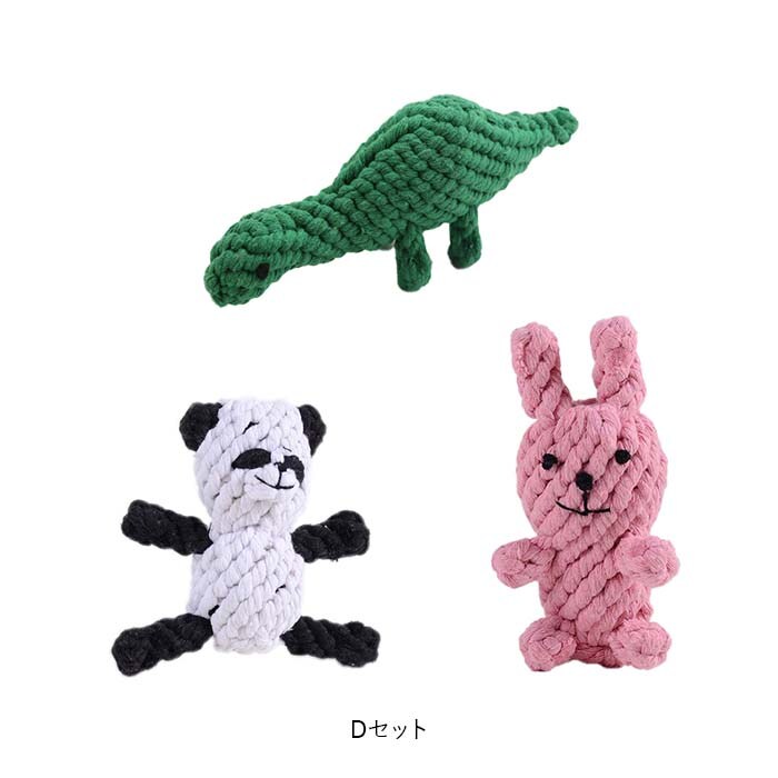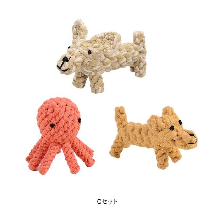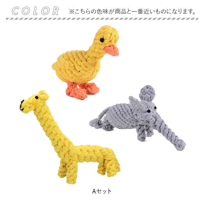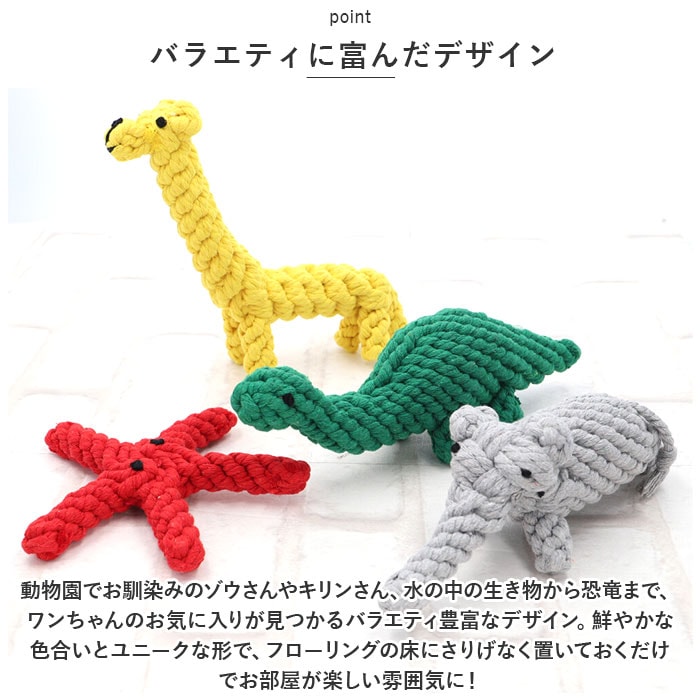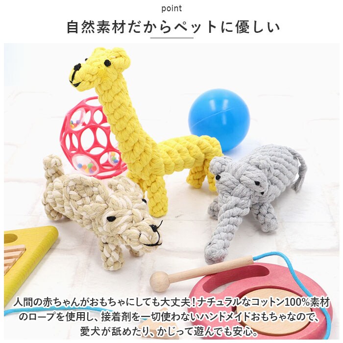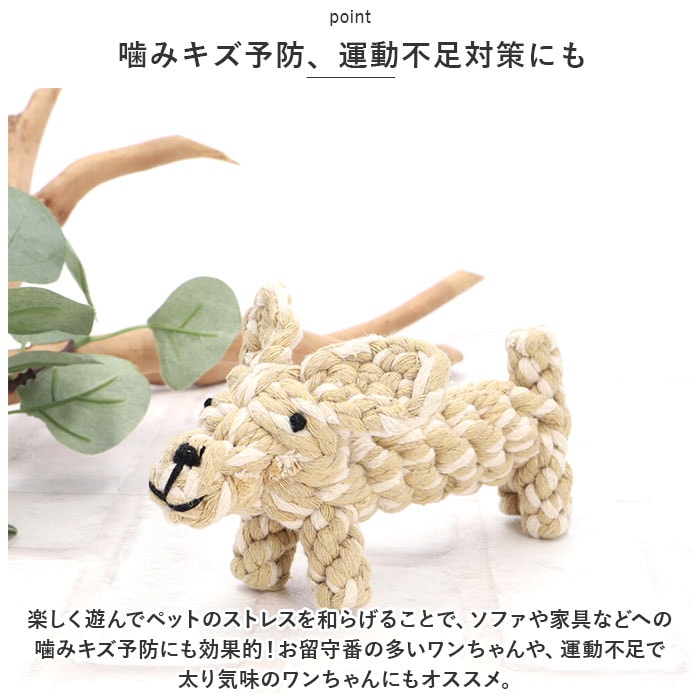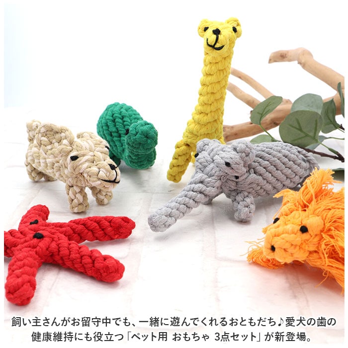 | 商品説明 | 飼い主さんがお留守中でも、一緒に遊んでくれるおともだち♪愛犬の歯の健康維持にも役立つ「ペット用 おもちゃ 3点セット」が新登場。【楽しく遊べる、素朴なロープおもちゃ】カラフルなコットンのロープを、ウサギさんやアヒルさんなど、可愛らしいアニマルの形に編み込んで仕上げたドッグ用ロープトイ。素朴な雰囲気と優しい噛み応えにワンちゃん夢中。【自然素材だからペットに優しい】人間の赤ちゃんがおもちゃにしても大丈夫!ナチュラルなコットン100%素材のロープを使用し、接着剤を一切使わないハンドメイドおもちゃなので、愛犬が舐めたり、かじって遊んでも安心。【カミカミ遊んで、デンタルケア】ロープの編み目にワンちゃんの歯がすっぽりと入って、歯の汚れや食べかすを自然に除去しながら、歯茎を優しくマッサージ。歯垢や歯石の蓄積を防いで、ワンちゃんのお口の健康をサポート。【噛みキズ予防、運動不足対策にも】楽しく遊んでペットのストレスを和らげることで、ソファや家具などへの噛みキズ予防にも効果的!お留守番の多いワンちゃんや、運動不足で太り気味のワンちゃんにもオススメ。【バラエティに富んだデザイン】動物園でお馴染みのゾウさんやキリンさん、水の中の生き物から恐竜まで、ワンちゃんのお気に入りが見つかるバラエティ豊富なデザイン。鮮やかな色合いとユニークな形で、フローリングの床にさりげなく置いておくだけでお部屋が楽しい雰囲気に!【ペットライフが充実!】ペットと一緒に遊んでコミュニケーションを取りたい時や、愛犬・愛猫とのポートレート撮影の小道具にもピッタリ。ペット系ユーチューバーさんの撮影グッズとしても大活躍♪ |