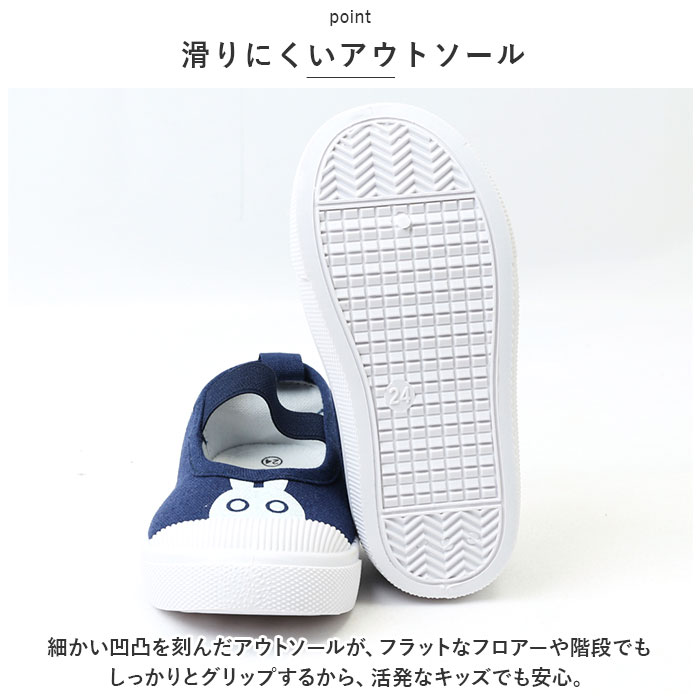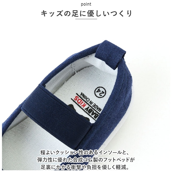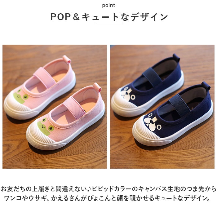 | 商品説明 | スクールライフを可愛らしいアニマルたちが応援!ポップな絵柄が楽しい「キッズ用スクールシューズ(上履き)」が新登場。【キッズの足に優しいつくり】程よいクッション性のあるインソールと、弾力性に優れた合成ゴム製のフットベッドが足裏にかかる衝撃や負担を優しく軽減。【かる~い履き心地】片足わずか105gの軽量設計で、まるで素足のままでいるようなふわっと軽い履き心地を実現。(※16cmサイズの商品、片足分の当店計測重量です。)【丸いカタチがつま先をガード】アウトソール先端は、つま先部分を包み込むように丸いフォルムに仕上げ、うっかりつま先をぶつけてしまっても痛くない安心仕様。【スポッと履けて、脱げにくい!】混雑する学校の昇降口でもスポッと履ける!ゴムベルトが足の甲にぴったりフィットして、脱げにくいのも嬉しいポイント。【滑りにくいアウトソール】細かい凹凸を刻んだアウトソールが、フラットなフロアーや階段でもしっかりとグリップするから、活発なキッズでも安心。【抜群の動きやすさ】屈曲性に優れたアウトソールは動きやすさも抜群。軽くて動きやすいため、体育館での運動やダンスのような習い事にも大活躍!【お手入れ簡単、いつでも清潔】インソールは取り外しができるので、手軽に水洗いができていつでも清潔さをキープ。【POP&キュートなデザイン】お友だちの上履きと間違えない♪ビビッドカラーのキャンバス生地のつま先から、ワンコやウサギ、かえるさんがぴょこんと顔を覗かせるキュートなデザイン。 |