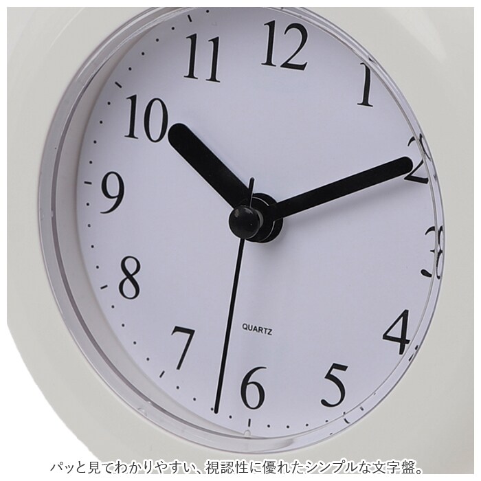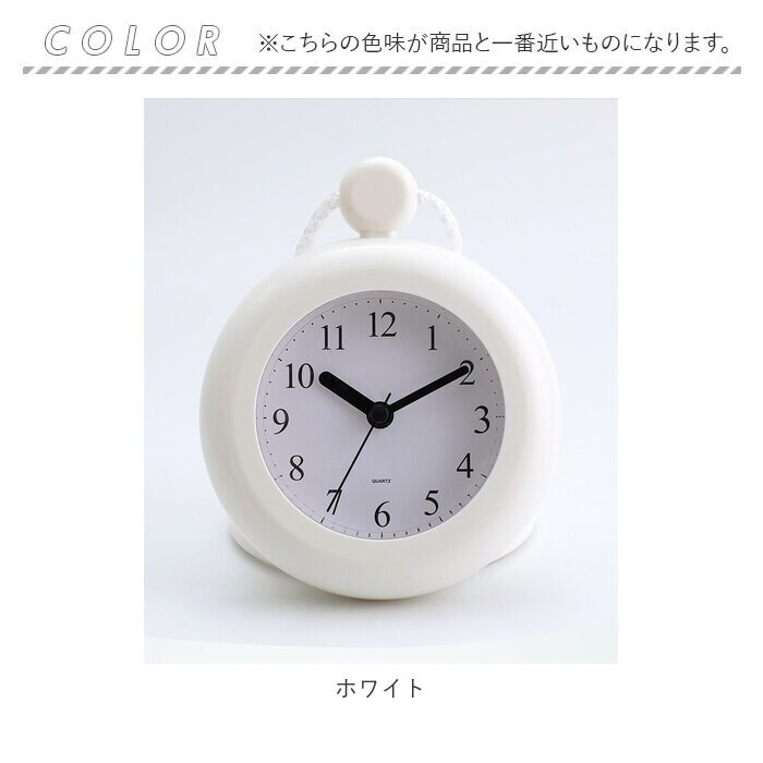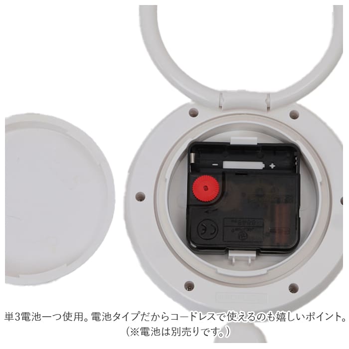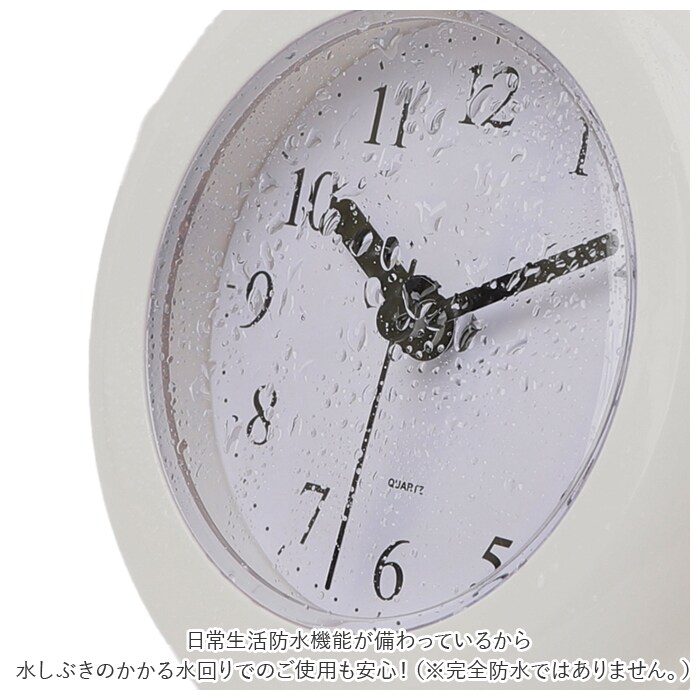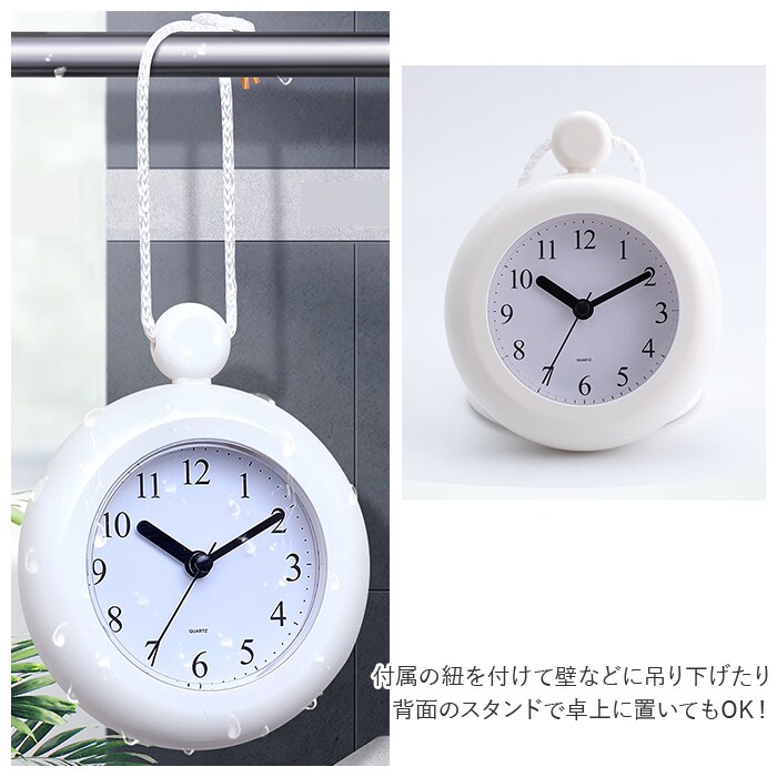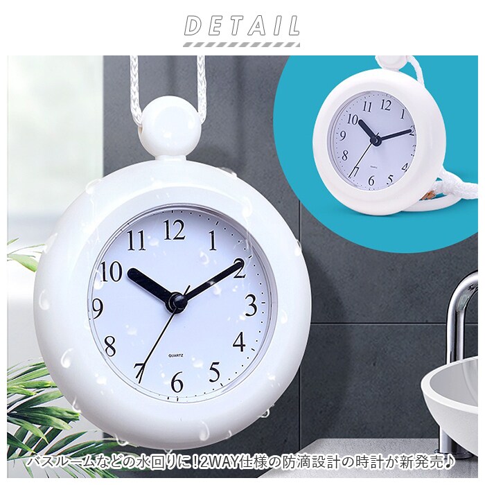 | 商品説明 | バスルームなどの水回りに!2WAY仕様の防滴設計の時計が新発売♪コロンと丸い形が可愛いデザイン♪付属の紐を付けて壁などに吊り下げたり、背面のスタンドで卓上に置いてもOK!日常生活防水機能が備わっているから、水しぶきのかかる水回りでのご使用も安心!(※完全防水ではありません。)パッと見てわかりやすい、視認性に優れたシンプルな文字盤。単3電池一つ使用。電池タイプだからコードレスで使えるのも嬉しいポイント。(※電池は別売りです。) |