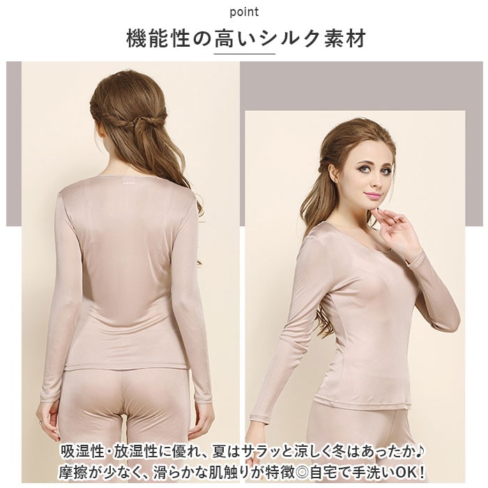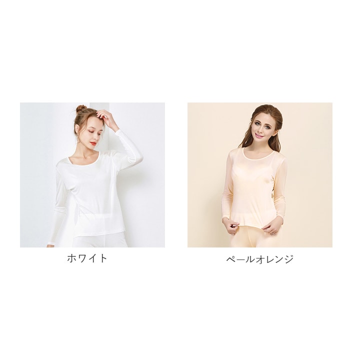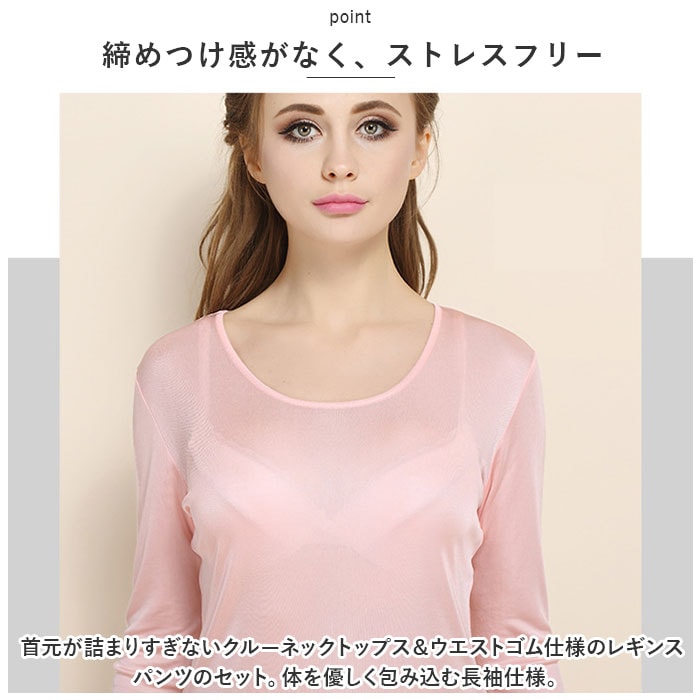 | 商品説明 | お肌も心もリラックスできる、シルク素材のパジャマインナーが新登場。【着心地バツグン♪】パジャマ1枚では少し寒い時、肌あたりが気になる時に役立つパジャマインナー。薄手のソフトな生地感でごわつかず、快適な睡眠をサポート。【機能性の高いシルク素材】吸湿性・放湿性に優れ、夏はサラッと涼しく冬はあったか♪摩擦が少なく、滑らかな肌触りが特徴◎自宅で手洗いOK!【締めつけ感がなく、ストレスフリー】首元が詰まりすぎないクルーネックトップス&ウエストゴム仕様のレギンスパンツのセット。体を優しく包み込む長袖仕様。【選べるカラーバリエーション】肌なじみの良いカラーをラインナップ。洗い替え用に色違いで揃えるのもおすすめ。 |