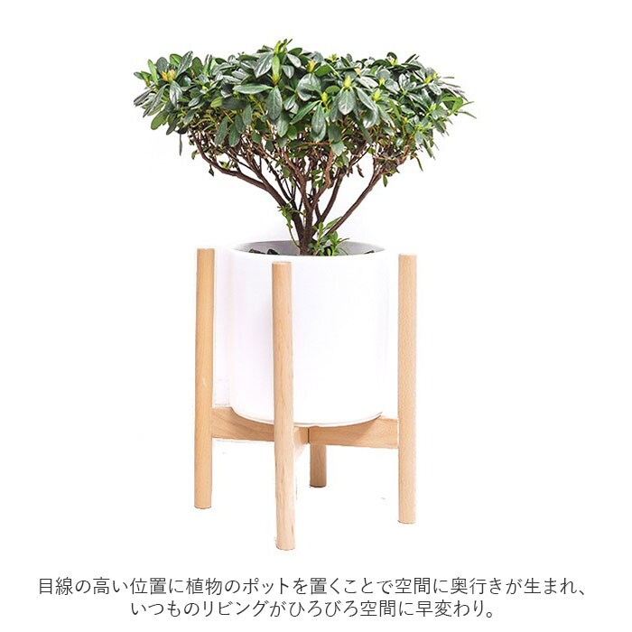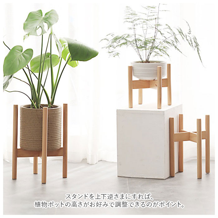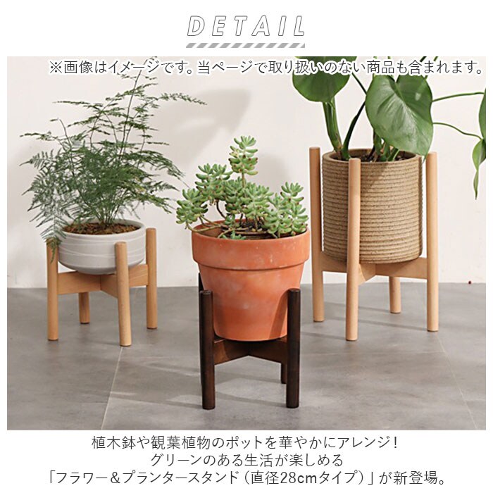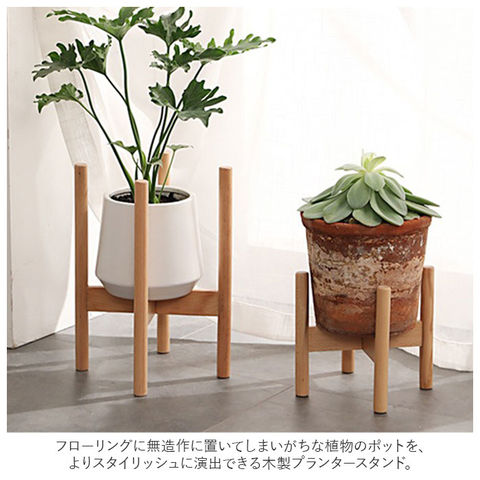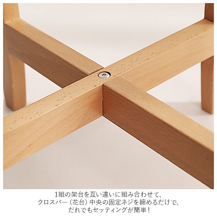 | 商品説明 | 植木鉢や観葉植物のポットを華やかにアレンジ!グリーンのある生活が楽しめる「フラワー&プランタースタンド(直径28cmタイプ)」が新登場。フローリングに無造作に置いてしまいがちな植物のポットを、よりスタイリッシュに演出できる木製プランタースタンド。目線の高い位置に植物のポットを置くことで空間に奥行きが生まれ、いつものリビングがひろびろ空間に早変わり。スタンドを上下逆さまにすれば、植物ポットの高さがお好みで調整できるのがポイント。ポトスやオリヅルランなど、ツル性の植物を立体的に魅せたいときにも最適。1組の架台を互い違いに組み合わせて、クロスバー(花台)中央の固定ネジを締めるだけで、だれでもセッティングが簡単!フローリングなど滑りやすいフロアでも安心な、滑り止めスポンジシール付き。床へのキズ防止にも効果的。(※付属のスポンジシールを、お客様ご自身で貼り付けていただくスタイルです。)プランタースタンドとしてだけでなく、空気清浄機や加湿器のような小型家電用のスタンドなど、使い方は自分次第!ナチュラルな木製素材なので、北欧風のウッディーなインテリアとも相性抜群。【セット内容】・・・架台×2本、固定ネジ×1本、L字型六角ネジレンチ×1本、滑り止めスポンジシール×4個。 |