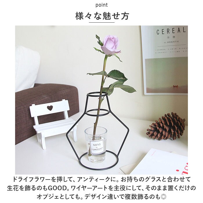 | 商品説明 | ワイヤーアートが魅せる、華奢なシルエットが斬新。「花瓶 フラワーベース」が登場。【ワイヤーシルエット】ボトルモチーフのワイヤーアートフラワーベース。シンプルながらも斬新なデザインで、お部屋のインテリアとして抜群の存在感。ワイヤーアートが魅せる、華奢なシルエットが魅力。【様々な魅せ方】ドライフラワーを挿して、アンティークに。お持ちのグラスと合わせて生花を飾るのもGOOD。ワイヤーアートを主役にして、そのまま置くだけのオブジェとしても。デザイン違いで複数飾るのも◎様々な魅せ方を楽しめる。【お好きなカラーを】カラーにより印象が大きく変わるので、お部屋の雰囲気やお好みに合わせてチョイスして。アイアン風もアンティーク調も楽しめ、お家のインテリアをワンランクアップ。【バリエーションが豊富なデザイン】デザインのバリエーションが豊富なので、お気に入りを選ぶのも楽しい♪お好みのフラワーベースがきっと見つかる。【ギフトにも】ご自宅用にはもちろん、お引越し祝いやお花やインテリアが好きな方へのギフトとしても最適。 |