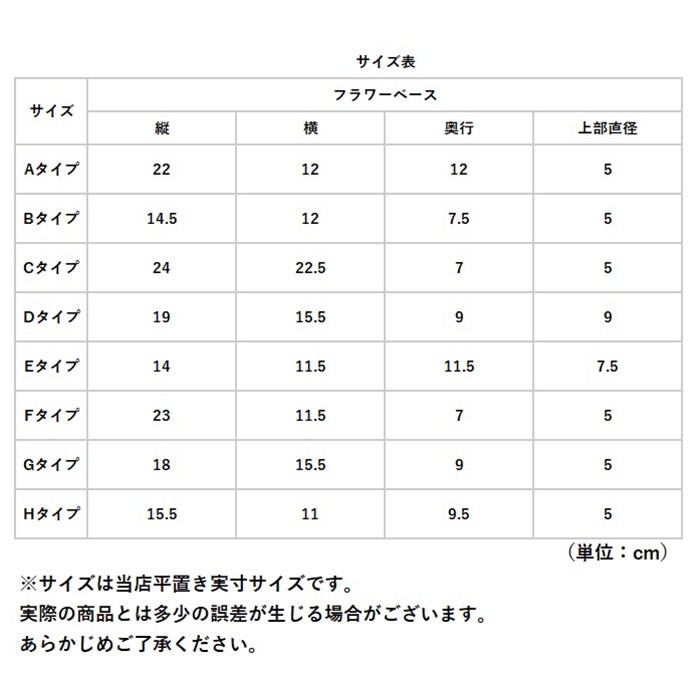 | サイズ | ・Aタイプ ・Bタイプ ・Cタイプ ・Dタイプ ・Eタイプ ・Fタイプ ・Gタイプ ・Hタイプ ※サイズについて詳細は、商品画像の中にあるサイズ表をご覧くださいませ。 |