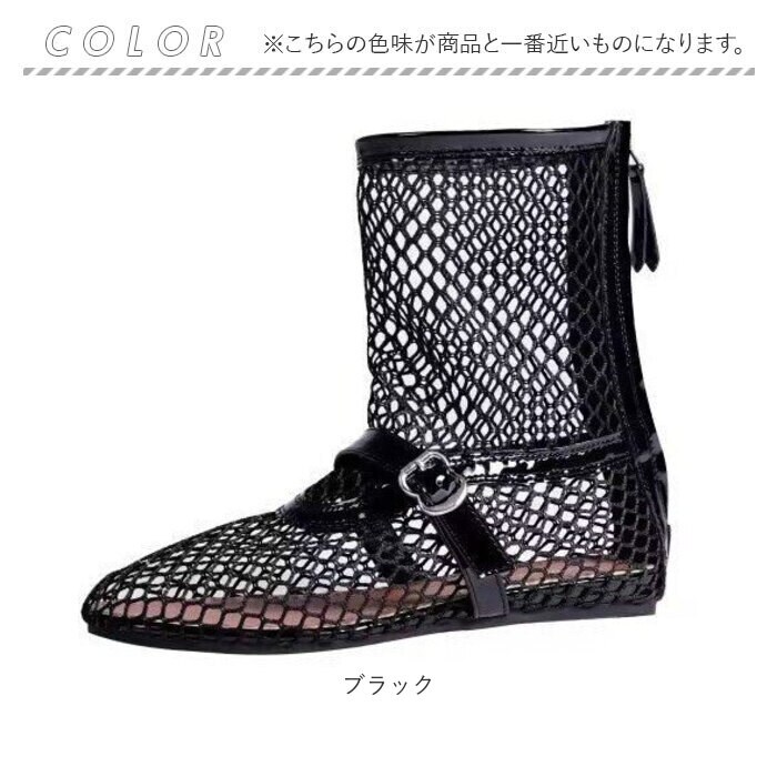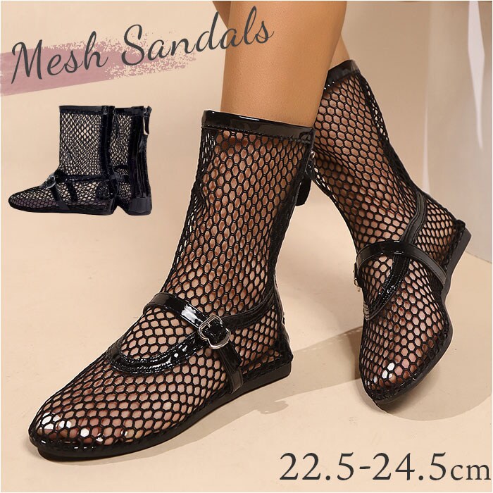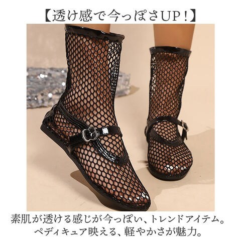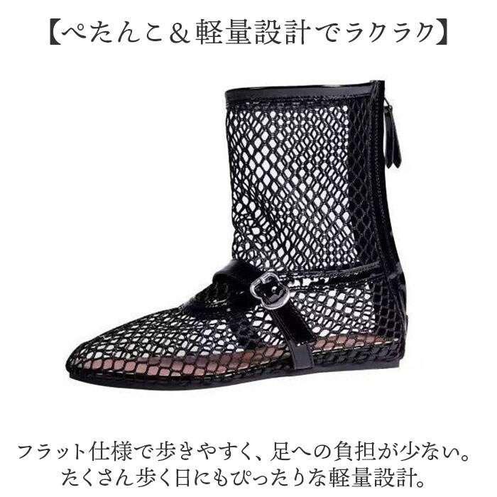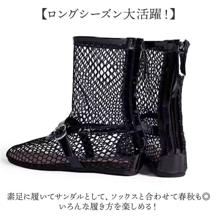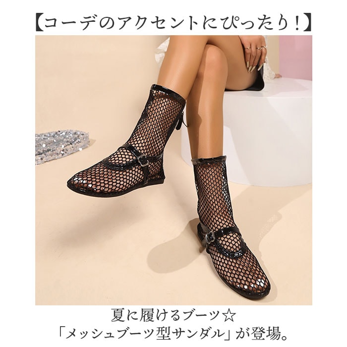 商品説明【コーデのアクセントにぴったり!】夏に履けるブーツ☆「メッシュブーツ型サンダル」が登場。【透け感で今っぽさUP!】素肌が透ける感じが今っぽい、トレンドアイテム。ペディキュア映える、軽やかさが魅力。【コーデの主役はこれにおまかせ】足元にポイントを置きたい方にオススメ!いつものコーデにプラスすれば、グッと垢ぬける♪【やわらかく足にフィット】やわらかなメッシュ素材が足を包み込み、優しくフィット。ストレスフリーの履き心地。【ぺたんこ&軽量設計でラクラク】フラット仕様で歩きやすく、足への負担が少ない。たくさん歩く日にもぴったりな軽量設計。【着脱しやすいファスナー仕様】ストラップにはグンと伸びるゴム素材を採用。ファスナーでサッと脱ぎ履きができる作り。【存在感があるのに合わせやすい!】履くだけでコーデのアクセントになるのに、いろんなお洋服にマッチする、バツグンの着回し力♪【ロングシーズン大活躍!】素足に履いてサンダルとして、ソックスと合わせて春秋も◎いろんな履き方を楽しめる!【他ページにてサンダルを販売中☆】同じメッシュデザインのサンダルタイプをご用意!お気に入りの一足をチョイス。