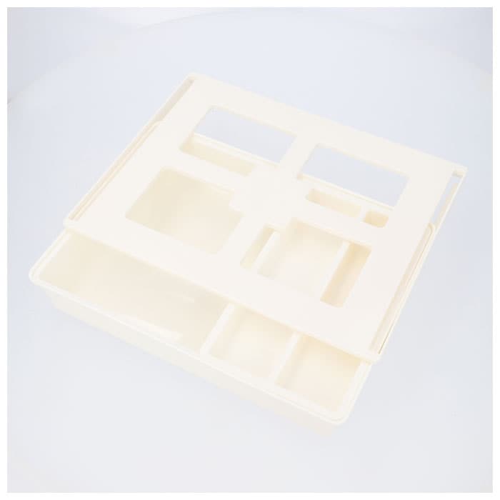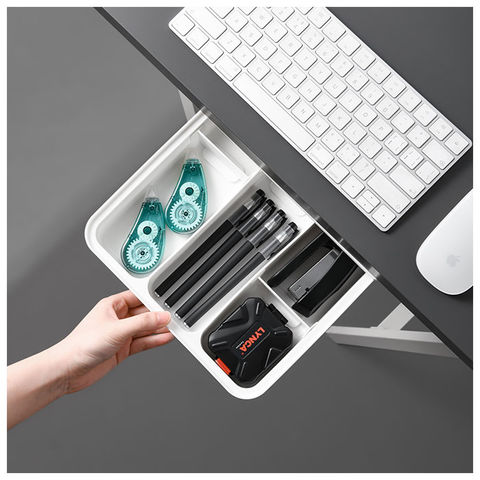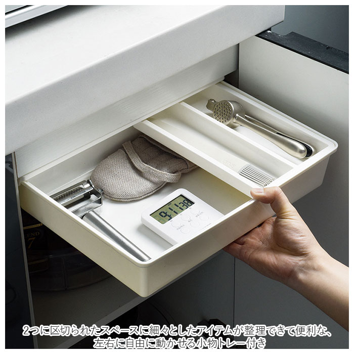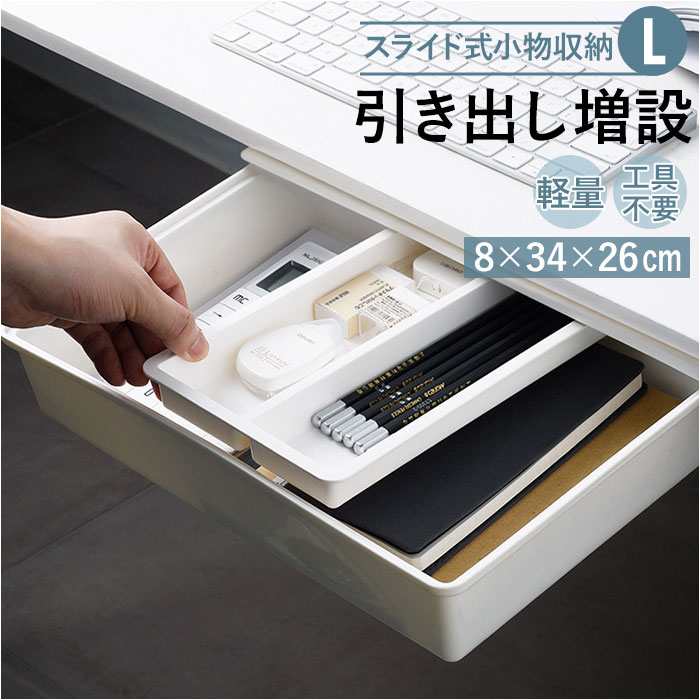 | 商品説明 | お仕事用デスクや収納棚の下の空きスペースを有効活用!「スライド式小物収納(Lサイズ)」が新登場。パソコンデスクやダイニングテーブル、キッチンキャビネットの棚下などに、便利な引き出しが増設できるたっぷり収納ボックス。テレワークのデスクで散らばりがちな筆記用具や電卓などのステーショナリーをまとめて収納すれば、机の上がより広々とした作業スペースに。キッチンキャビネット内側の棚板などに設置することで、ピーラーやキッチンスケールのようなツール類を収納して、キッチントップもすっきりと。2つに区切られたスペースに細々としたアイテムが整理できて便利な、左右に自由に動かせる小物トレー付き。付属の7枚の粘着テープで手軽に取り付けができるため、特別な工具は不要。ネジ留めなどで家具を傷つける心配がないのも嬉しいポイント。お部屋のインテリアに優しく調和する柔らかなホワイトカラー。軽量で汚れや水滴に強いプラスチック樹脂製なので、お手入れも楽ちん。スライド式小物収納シリーズ「Sサイズ」「Mサイズ」と組み合わせて小物を整理すれば、だれでも収納上手に!(※スライド式小物収納「Sサイズ(pkhz1)」「Mサイズ(pkhz2)」は、別商品ページでお買い求めいただけます。ストアの検索窓に、英数字の商品コードを入力してご覧ください。) |