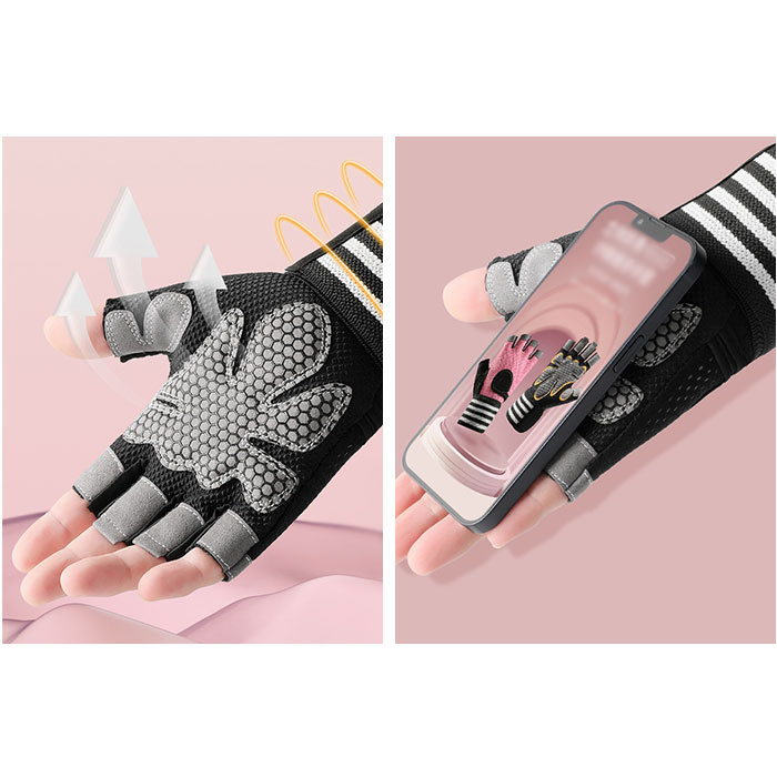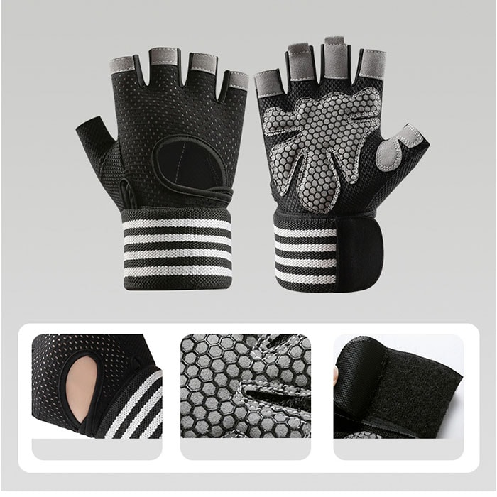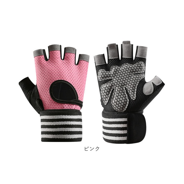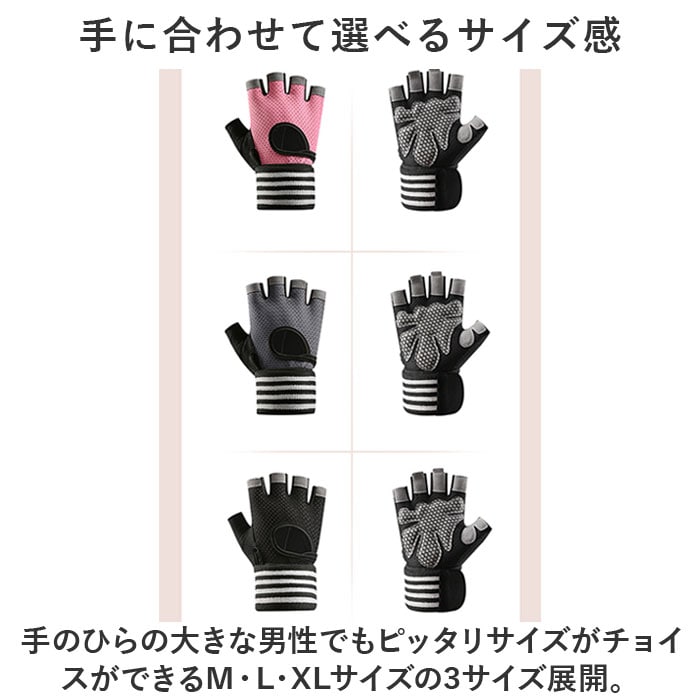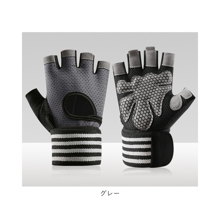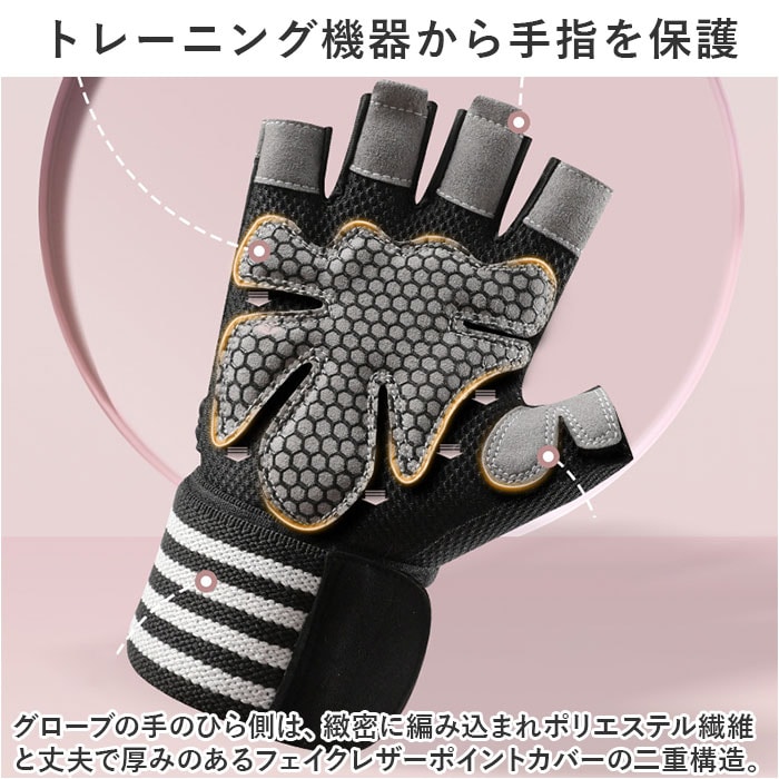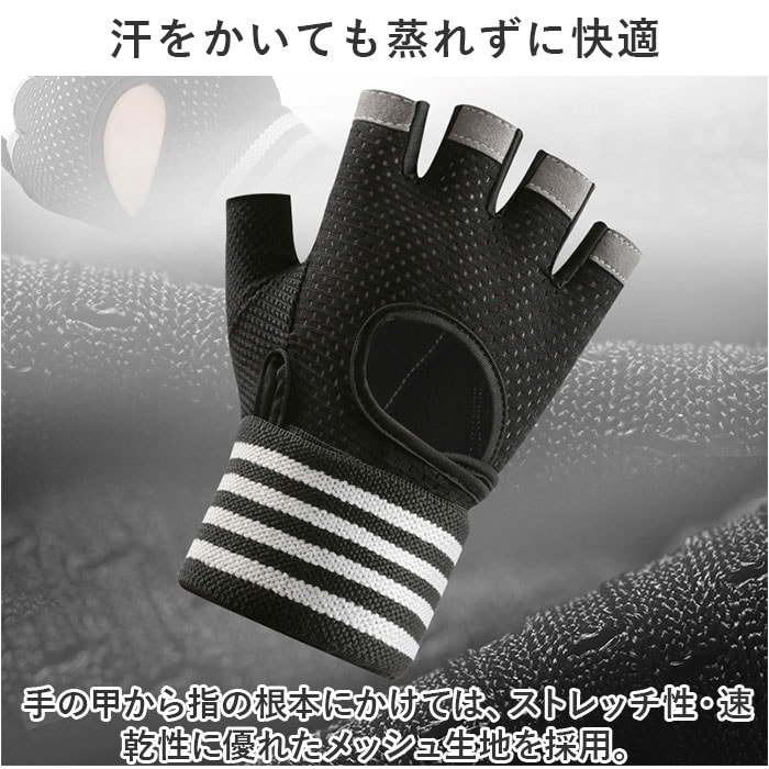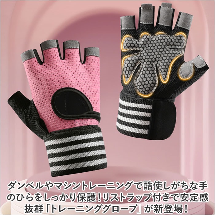 | 商品説明 | ダンベルやマシントレーニングで酷使しがちな手のひらをしっかり保護!リストラップ付きで安定感抜群「トレーニンググローブ」が新登場!【トレーニング機器から手指を保護】グローブの手のひら側は、緻密に編み込まれポリエステル繊維と丈夫で厚みのあるフェイクレザーポイントカバーの二重構造。ダンベルやバーベル運動など、ウェイトトレーニング時の擦り切れから手指を優しく保護。【抜群のグリップ力で筋トレ効率UP】指の腹と手のひら中央に配置されたフェイクレザーポイントカバーのうち、手のひら部分にはハニカム形状のシリコンプリント加工を施し、トレーニング機器をしっかりグリップ。汗による滑りを防いで、筋トレ効率が飛躍的にUP!【ハーフフィンガーデザイン】フィットネス機器の設定や、バーベルの重量プレート交換など、細かい手元の作業もラクラクこなせる、指先の開いたフィンガーレスタイプ。【リストラップで手首を保護】面ファスナー式のリストラップを巻き付けて装着することで、グローブの脱げ落ちを防止するとともに手首への負担を軽減。負荷の大きなトレーニング中の安定感が向上し、より安全にトレーニングが楽しめる。【スムーズに外せるプルタブ付き】中指・薬指の内側には、もう片方の指を引っかけてグローブがスムーズに外せるプルタブ付き。特に擦り切れやダメージを受けやすい指の腹の保護にも効果的。【汗をかいても蒸れずに快適】手の甲から指の根本にかけては、ストレッチ性・速乾性に優れたメッシュ生地を採用。手の甲側の中央が丸く開いたデザインなので、トレーニング中も蒸れずに快適。【カバンに忍ばせてラクラク持ち運び】お仕事帰りのすき間時間を活用して24時間ジムに通っているビジネスパーソンに嬉しい、かさばらずに持ち運びに便利な軽い素材使いがポイント。【ご家庭で簡単お洗濯♪】取り扱いの楽なポリエステル・ポリウレタン混紡素材なので、ご家庭で手軽に丸洗いができるのも嬉しいポイント。こまめにお手入れしていつでも清潔さをキープ。(※タンブラー乾燥はご利用いただけません。) |