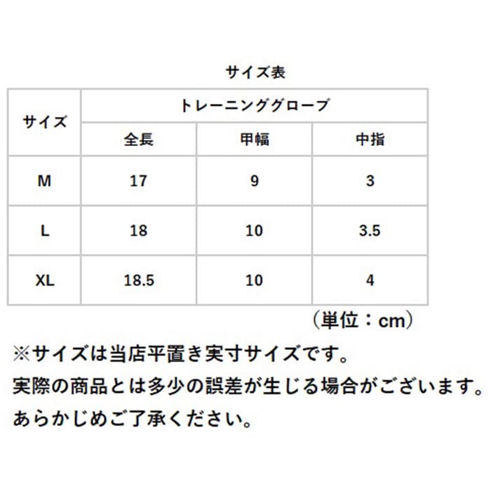 | サイズ | [トレーニンググローブ] ・Mサイズ ・Lサイズ ・XLサイズ ※サイズについて詳細は、商品画像の中にあるサイズ表をご覧くださいませ。 |