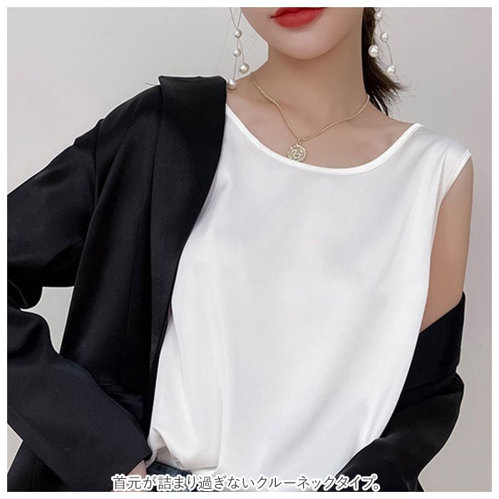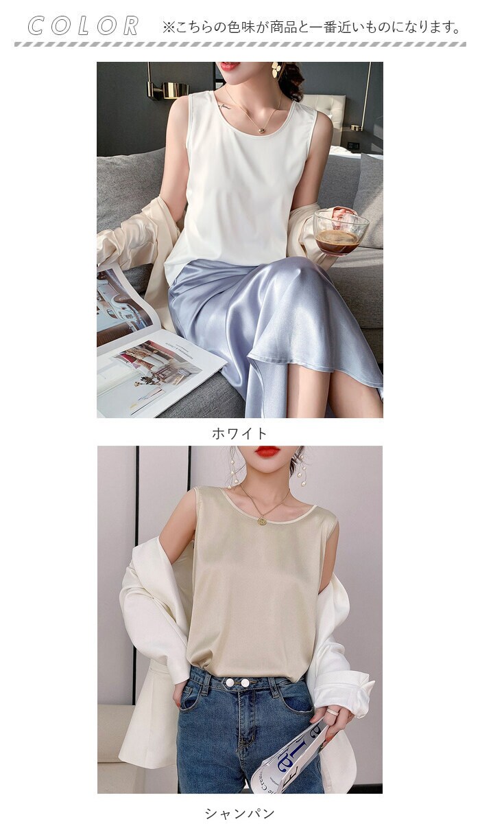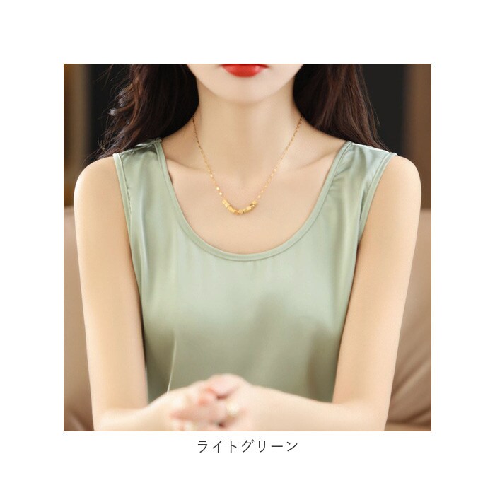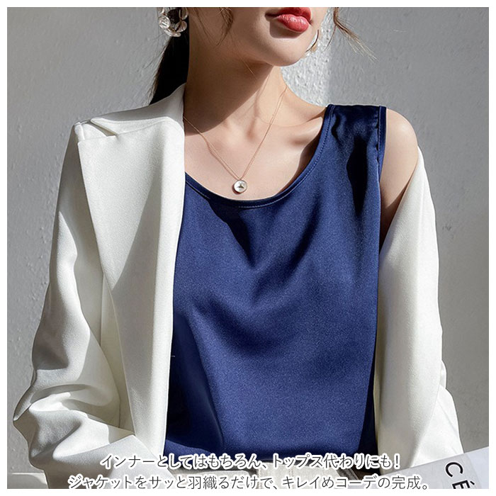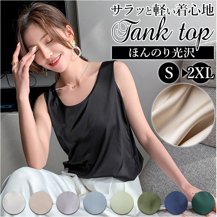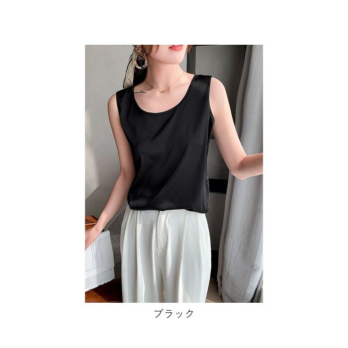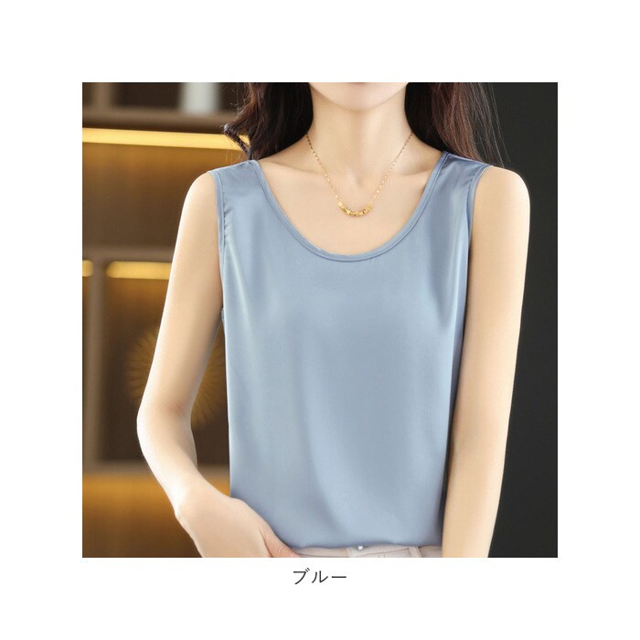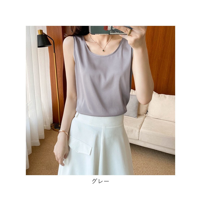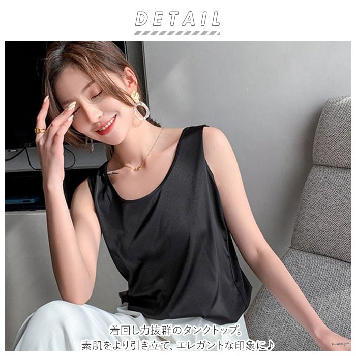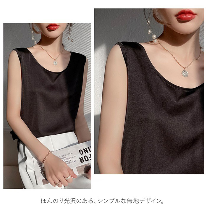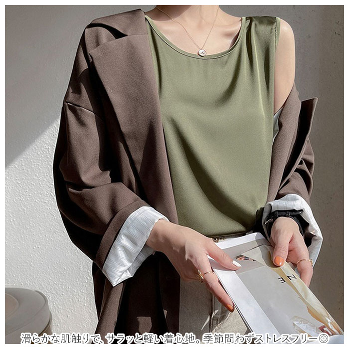 | 商品説明 | 着回し力抜群のタンクトップ。ほんのり光沢のある、シンプルな無地デザイン。首元が詰まり過ぎないクルーネックタイプ。滑らかな肌触りで、サラッと軽い着心地。季節問わずストレスフリー◎インナーとしてはもちろん、トップス代わりにも!ジャケットをサッと羽織るだけで、キレイめコーデの完成。素肌をより引き立て、エレガントな印象に♪ |
