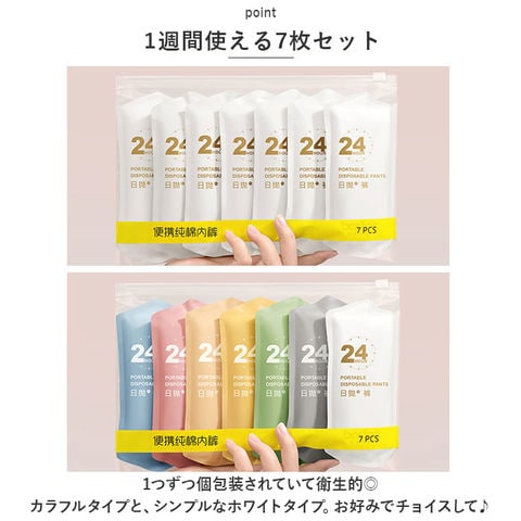 | 商品説明 | 長期間の外出や災害時に活躍!使い捨てショーツ(7枚セット)が新登場。【便利な使い捨てタイプ】旅行や出張、入院など長期間の外出で洗濯ができない時に♪着用済みのショーツをそのまま持ち歩く必要なし!【お肌に優しい生地感】毛羽立ちが少なく丈夫な綿コーマを使用。柔らかく優しい肌触りで、安心して使えるショーツ。【汗ばむ季節も快適】通気性にも優れており、汗をかいてもムレにくい♪【優しくサポート】お尻まわりをしっかり包み込んでくれる深ばきタイプ。いや~な食い込みやズレをガード!【いざという時の備えに】・1つずつ個包装されていて衛生的◎防災グッズにリストアップしておくのもおすすめ。【1週間使える7枚セット】カラフルタイプと、シンプルなホワイトタイプ。お好みでチョイスして♪ |