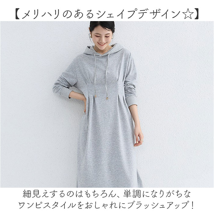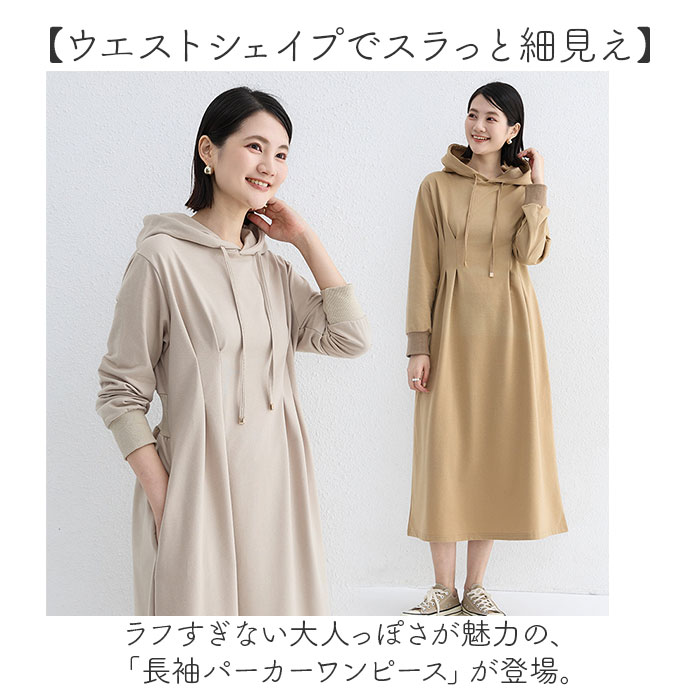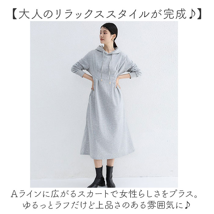 | 商品説明 | 【ウエストシェイプでスラっと細見え】ラフすぎない大人っぽさが魅力の、「長袖パーカーワンピース」が登場。【メリハリのあるシェイプデザイン☆】細見えするのはもちろん、単調になりがちなワンピスタイルをおしゃれにブラッシュアップ!【大人のリラックススタイルが完成♪】Aラインに広がるスカートで女性らしさをプラス。ゆるっとラフだけど上品さのある雰囲気に♪【こだわりのワントーン仕上げ】ワントーンで仕上げたシンプルさが魅力。洗練された印象で、こなれたおしゃれが叶うワンピ【便利なポケットつきでお出かけも◎】スマホや小物をサッと入れられるポケットつき!何かと便利でお出かけも快適に☆【幅広いシーンで着られる1枚】締め付け感の少ないラクな着心地なので、お出かけだけでなくお家タイムにもぴったり☆ |