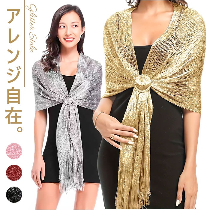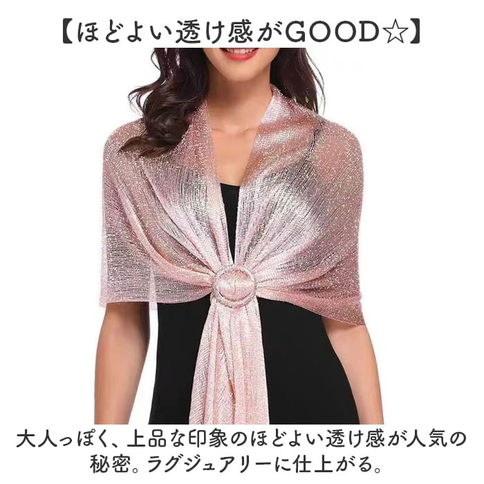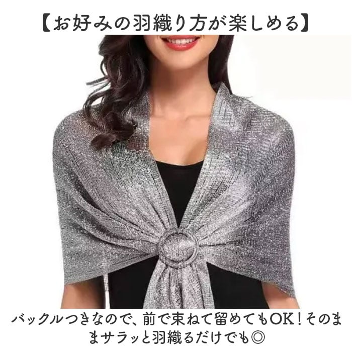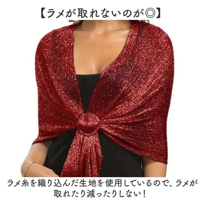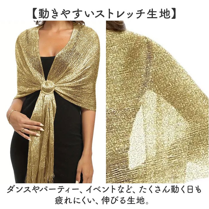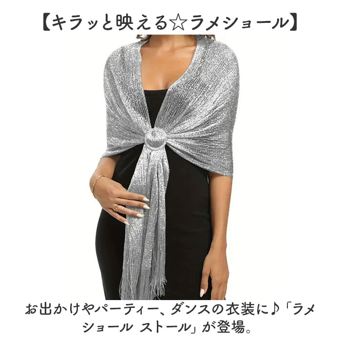 | 商品説明 | 【キラッと映える☆ラメショール】お出かけやパーティー、ダンスの衣装に♪「ラメショール ストール」が登場。【光にあたってキラキラ輝く!】太陽の光や、ステージ照明にあたるとキラッと華やかに輝く、大人のアイテム。【ラメが取れないのが◎】ラメ糸を織り込んだ生地を使用しているので、ラメが取れたり減ったりしない!【ほどよい透け感がGOOD☆】大人っぽく、上品な印象のほどよい透け感が人気の秘密。ラグジュアリーに仕上がる。【動きやすいストレッチ生地】ダンスやパーティー、イベントなど、たくさん動く日も疲れにくい、伸びる生地。【お好みの羽織り方が楽しめる】バックルつきなので、前で束ねて留めてもOK!そのままサラッと羽織るだけでも◎ |