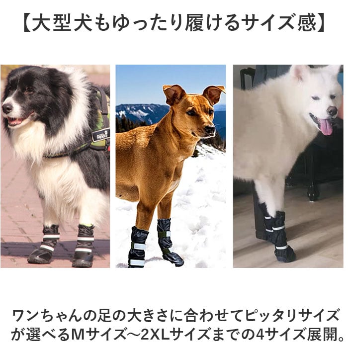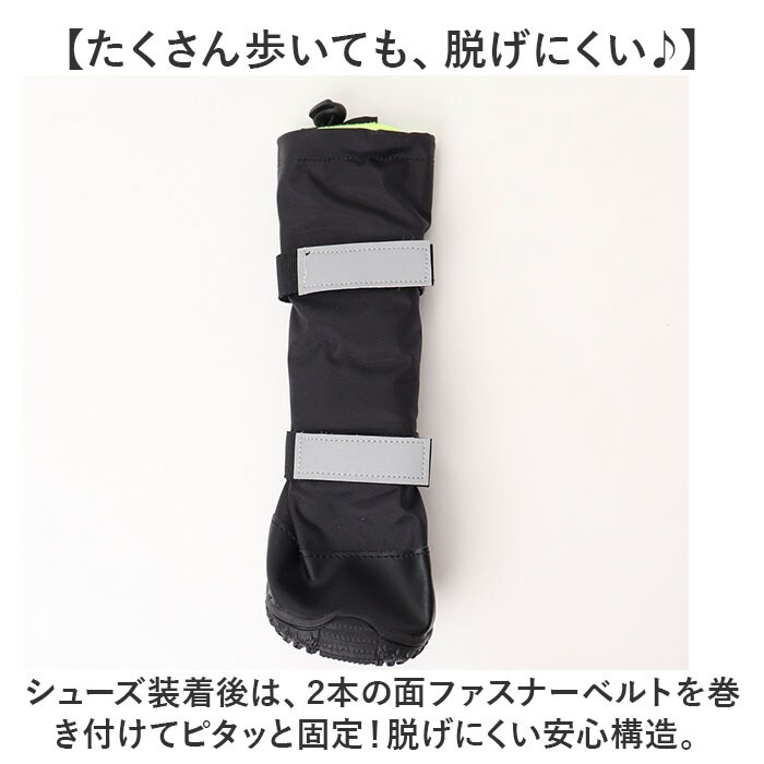 | 商品説明 | 【冷たい雨から愛犬の足を守る♪】水滴をサッと弾いて、雨の日も泥はねを気にせずに元気にお散歩!「ドッグ用防水シューズ」が新登場!【お散歩後の泥汚れにサヨナラ!】長靴のようなハイカットデザインでひじ・膝までしっかりカバー。お散歩後の足拭きの手間が軽減。【お散歩前にスポッと装着!】足首から履き口にかけて緩やかに生地が広がり、ワンちゃんの足がスポッと入って装着スムーズ。【たくさん歩いても、脱げにくい♪】シューズ装着後は、2本の面ファスナーベルトを巻き付けてピタッと固定!脱げにくい安心構造。【冷たい雨をサッと弾くはっ水素材】はっ水ナイロン生地が冷たい雨の水滴を玉のように弾くので、シューズの中はいつでも快適。【キュッと絞れるドローコード付き】履き口部分はドローコードでキュッと絞ることができるため、吹き付ける激しい雨の侵入もブロック!【ふわふわフリースで保温性も抜群】シューズの内側は肌触りの柔らかなフリース仕上げ!雪が積もった日でもシューズの中はぽかぽか。【底面滑り止め加工済み】靴底にはしっかり凹凸を刻んだ合成ゴム素材を使用し、雨で濡れた路面をがっちりグリップ。【キラリと光るリフレクター】面ファスナーベルトには自動車のライトをキラリと光る反射素材を配置し、夜のお散歩でも安心安全。【大型犬もゆったり履けるサイズ感】ワンちゃんの足の大きさに合わせてピッタリサイズが選べるMサイズ~2XLサイズまでの4サイズ展開。※足裏縦幅約8.5cm(Mサイズ)~約11cm(2XLサイズ)程度までの、中大型犬~大型犬にちょうどいいサイズ感です。【肉球を守る、晴雨兼用タイプ】雨の日だけでなく、冬の乾燥時期や日射しで焼けた道路を歩く真夏のお散歩時の肉球保護にも最適。 |
