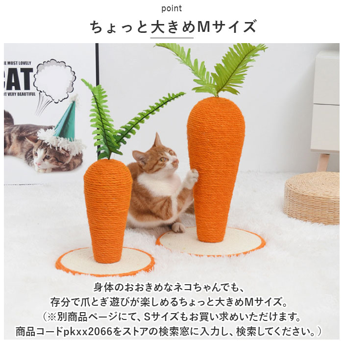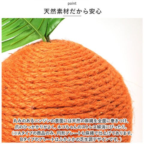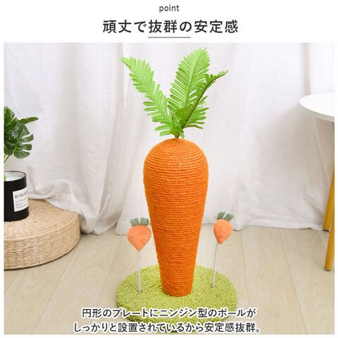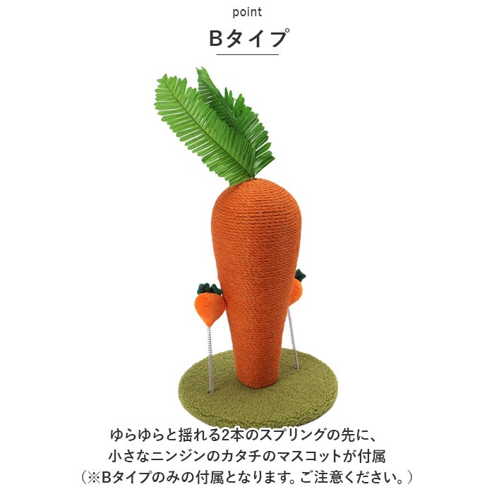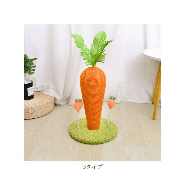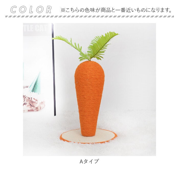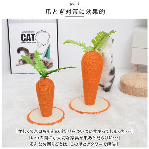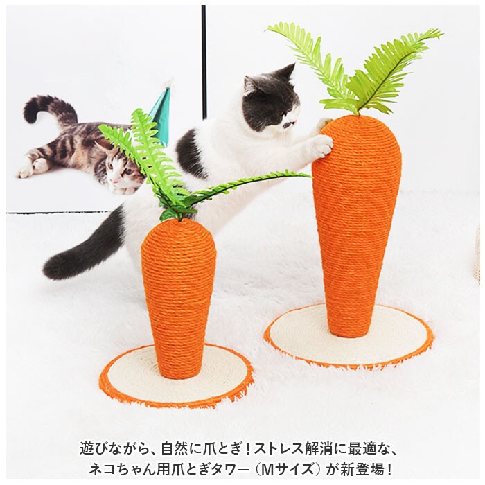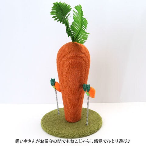 | 商品説明 | 遊びながら、自然に爪とぎ!ストレス解消に最適な、ネコちゃん用爪とぎタワー(Mサイズ)が新登場!【メルヘンポップなデザイン】丸いプレートからにょきっと生えた大きなニンジンに、ネコちゃん大興奮!おとぎ話にでてくる巨大な野菜畑のようなルックスがインパクト抜群!【爪とぎ対策に効果的】・「忙しくてネコちゃんの爪切りをついついサボってしまった・・・」「いつの間にか大切な家具が爪あとだらけに・・・」そんなお困りごとは、この爪とぎタワーで解決!【天然素材だから安心】丸みのあるニンジンの表面には天然の麻縄を全面に巻きつけ、爪のひっかかりがよく、ネコちゃんのストレス解消にぴったり。(※Aタイプの商品のみ、円形プレートも麻縄で仕上げてあります。Bタイプのプレートはふかふかの芝生調デザインです。)【ふわふわマスコット付き】(※Bタイプのみ)ゆらゆらと揺れる2本のスプリングの先に、小さなニンジンのカタチのマスコットがついているので、飼い主さんがお留守の間でもねこじゃらし感覚でひとり遊び♪(※Bタイプの爪とぎタワーにのみ付属しています。ご注意ください。)【誰でも簡単組み立て】付属のネジ1本と、六角レンチで組み立てが簡単!使用しないときにはパーツを取り外して、コンパクトに収納が可能。【頑丈で抜群の安定感】円形のプレートにニンジン型のポールがしっかりと設置されているから安定感抜群。ネコちゃんがしがみついたり寄りかかって爪とぎをしても安心。【ちょっと大きめMサイズ】身体のおおきめなネコちゃんでも、存分で爪とぎ遊びが楽しめるちょっと大きめMサイズ。【ペットライフが充実!】ネコちゃんとの記念撮影や、ペット系ユーチューバーの方の撮影グッズとしてもオススメ!ネコちゃんも飼い主さんも大満足のお役立つアイテム。 |