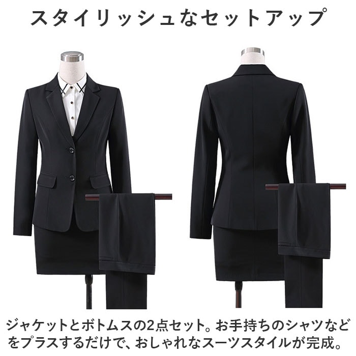 | 商品説明 | 色んなシーンで大活躍!かっこよくキマる、レディーススーツセットが新登場。【スタイリッシュなセットアップ】ジャケットとボトムスの2点セット。お手持ちのシャツなどをプラスするだけで、おしゃれなスーツスタイルが完成。【シンプルなシングルジャケット】フロントにボタンを1つ配置したデザイン。ソフトな肩パッド入りで、美しいカタチをキープ&スッと羽織れる裏地付き。左右にはポケットを配置。【すっきり魅せる2種類のボトムス】フロントファスナー&ボタン付きのパンツと、バックファスナー付きのスカートはどちらもボディラインにすっと馴染む!パンツは片ポケット付き。【体に負担をかけず着心地軽やか】程よい厚みの生地感で、サラッと着用できてストレスフリー◎【色んなシーンで活躍するカラー】落ち着きのあるベーシックカラーをご用意。ビジネスやフォーマルシーンにぴったり。 |