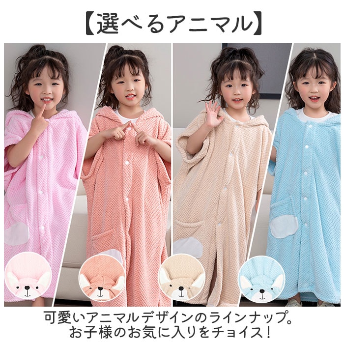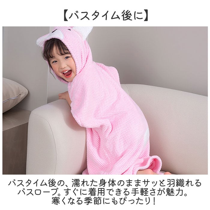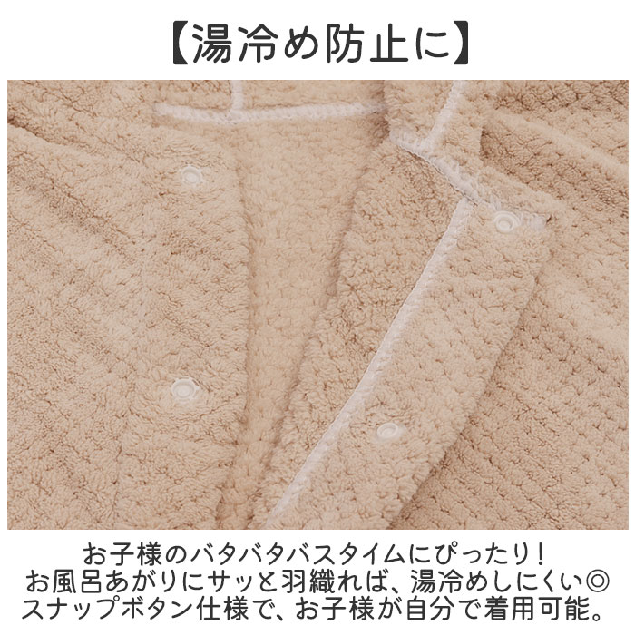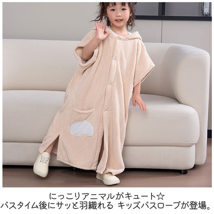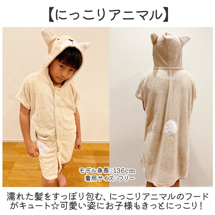 | 商品説明 | にっこりアニマルがキュート☆バスタイム後にサッと羽織れる キッズバスローブが登場。【バスタイム後に】バスタイム後の、濡れた身体のままサッと羽織れるバスローブ。すぐに着用できる手軽さが魅力。寒くなる季節にもぴったり!【にっこりアニマル】濡れた髪をすっぽり包む、にっこりアニマルのフードがキュート☆可愛い姿にお子様もきっとにっこり!【サラっと吸水】チクチクしない、ポリエステルやナイロン素材を使用したサラっとした生地。身体の水滴もしっかり吸収してくれる。【湯冷め防止に】お子様のバタバタバスタイムにぴったり!お風呂あがりにサッと羽織れば、湯冷めしにくい◎スナップボタン仕様で、お子様が自分で着用できるのもGOOD。【半袖タイプ】身体をダボっと覆う大きめの作りの半袖タイプ。バスローブを着たまま、腕や足に着たまま保湿などができる◎【選べるアニマル】可愛いアニマルデザインのラインナップ。お子様のお気に入りをチョイス! |