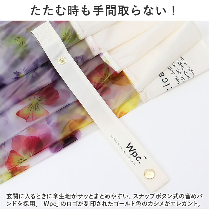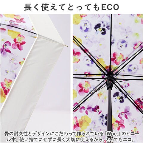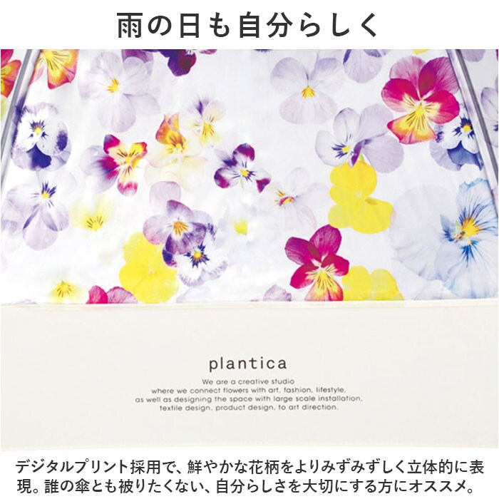 | 商品説明 | 傘生地いっぱいに咲き誇る、色とりどりの花が目に艶やか。大人気の「Plantica」コラボシリーズに、「パッチワークフラワーアンブレラ」が新登場。【About PLANTICA × Wpc.】花に関するアート・ファッション・デザインを手掛ける話題のフラワー・アートユニット「Plantica -プランティカ-」と、「Wpc.」がコラボレーションして誕生したプラスティックアンブレラ。【華やかなボタニカルモチーフ】柔らかな印象を与える半透明の生地と、散りばめられた美しい花柄が相性抜群。雨空に広げた傘に、道行く人がハッと振り返るデザイン。【雨の日も自分らしく】デジタルプリントを採用することで、鮮やかな花柄をよりみずみずしく、立体的に表現することに成功。誰の傘とも被りたくない、自分らしさを大切にする方にオススメ。【軽くて、しなやか、折れにくい】親骨の一部に強い風でもしなやかに受け止めるグラスファイバー素材を使用。耐風試験10m/sをクリアする耐久性と、ふわっと軽い差し心地を両立。【片手で簡単・ワンタッチ】片手に荷物がある時や、突然の雨でもワンタッチで傘生地がパッと広がるジャンプ式タイプ。【たたむ時も手間取らない!】玄関に入るときに傘生地がサッとまとめやすい、スナップボタン式の留めバンドを採用。「Wpc」のロゴが刻印されたゴールド色のカシメがエレガント。【手に馴染む手元ハンドル】滑らかな質感がすんなりと手に馴染む手元ハンドルには「Plantica」と「Wpc.」それぞれのロゴをプリント。細部まで洗練されたデザインも魅力のひとつ。【長く使えてとってもECO】骨の耐久性とデザインにこだわって作られている「Wpc.」のビニール傘。使い捨てにせずに長く大切に使えるから、とってもエコ。【フェミニンコーデが引き立つ】写実的な花柄をアイボリーの生地で縁取った切り継ぎデザインが、涼やかな女性らしさを引き立てる♪フェミニンな大人女子のスタイルにベストマッチ。 |